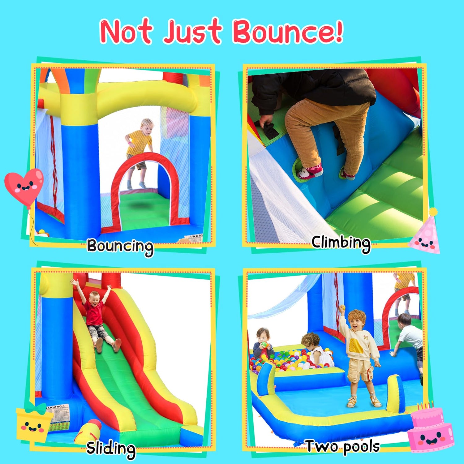 - Versatile and Portable: The separate pools function as both ball pits and water pools and the surprise water dump bucket is a fun addition to the slide, dumping water on unsuspecting kids as they ride down the slide. The 2 water sprinklers and cannon enhance the thrill of the slide experience by spraying and shooting water in every direction. Plus, it's portable, allowing you to bring it along on trips or to social gatherings and special events. The Baralir Inflatable Water Bounce House Slide is an ideal solution for keeping children engaged and lively throughout the summer season.