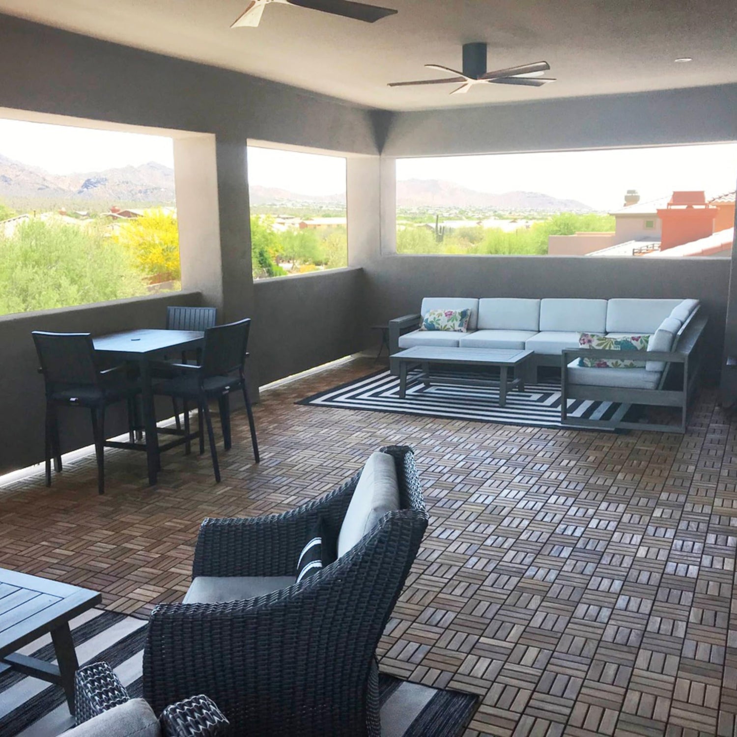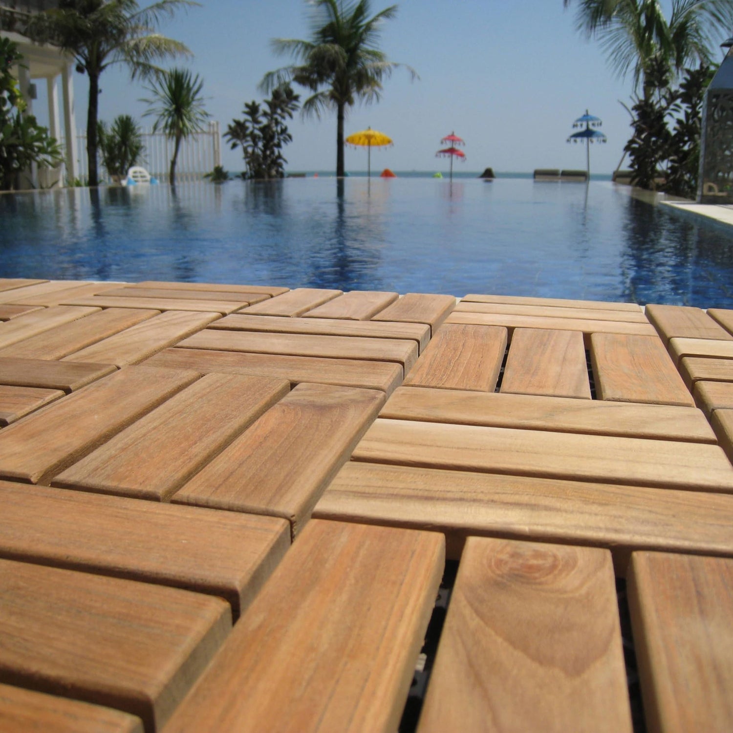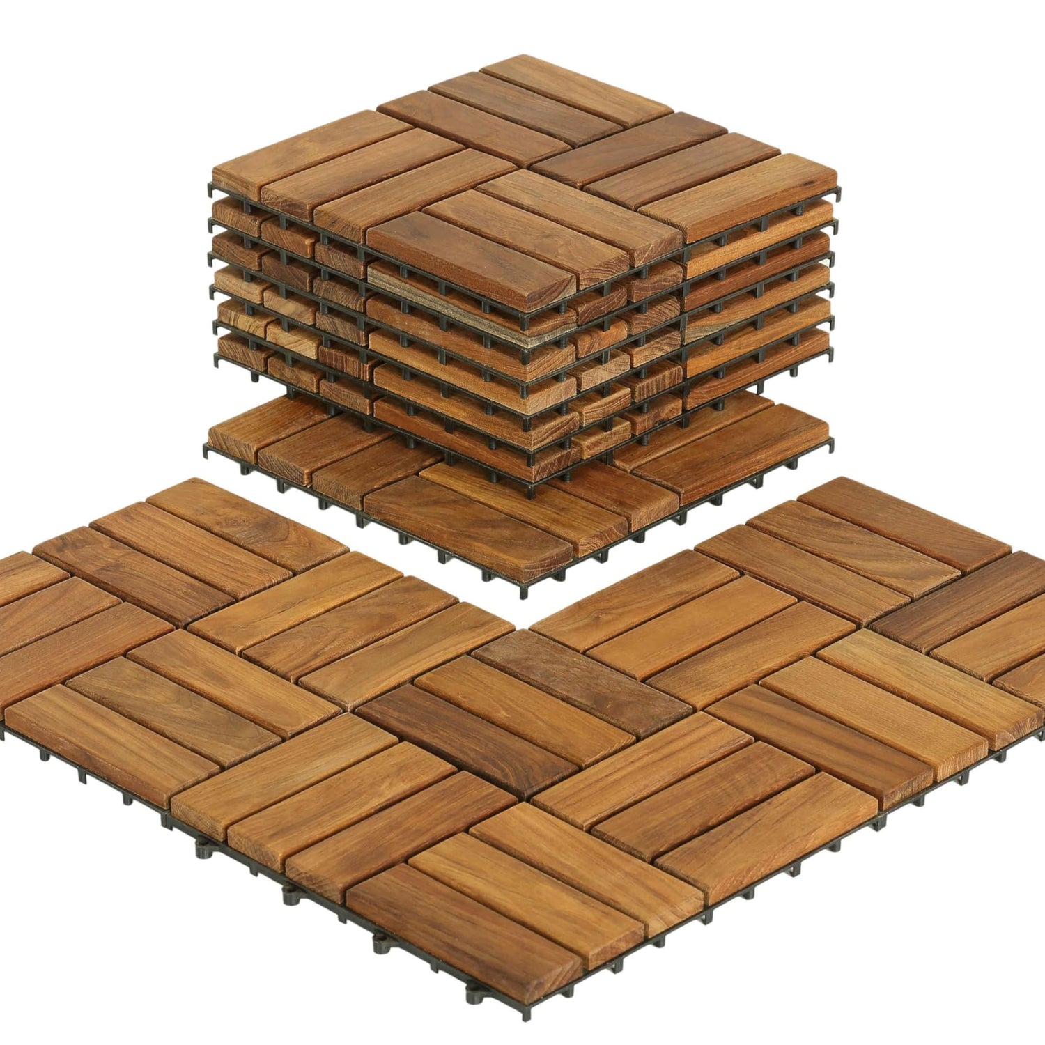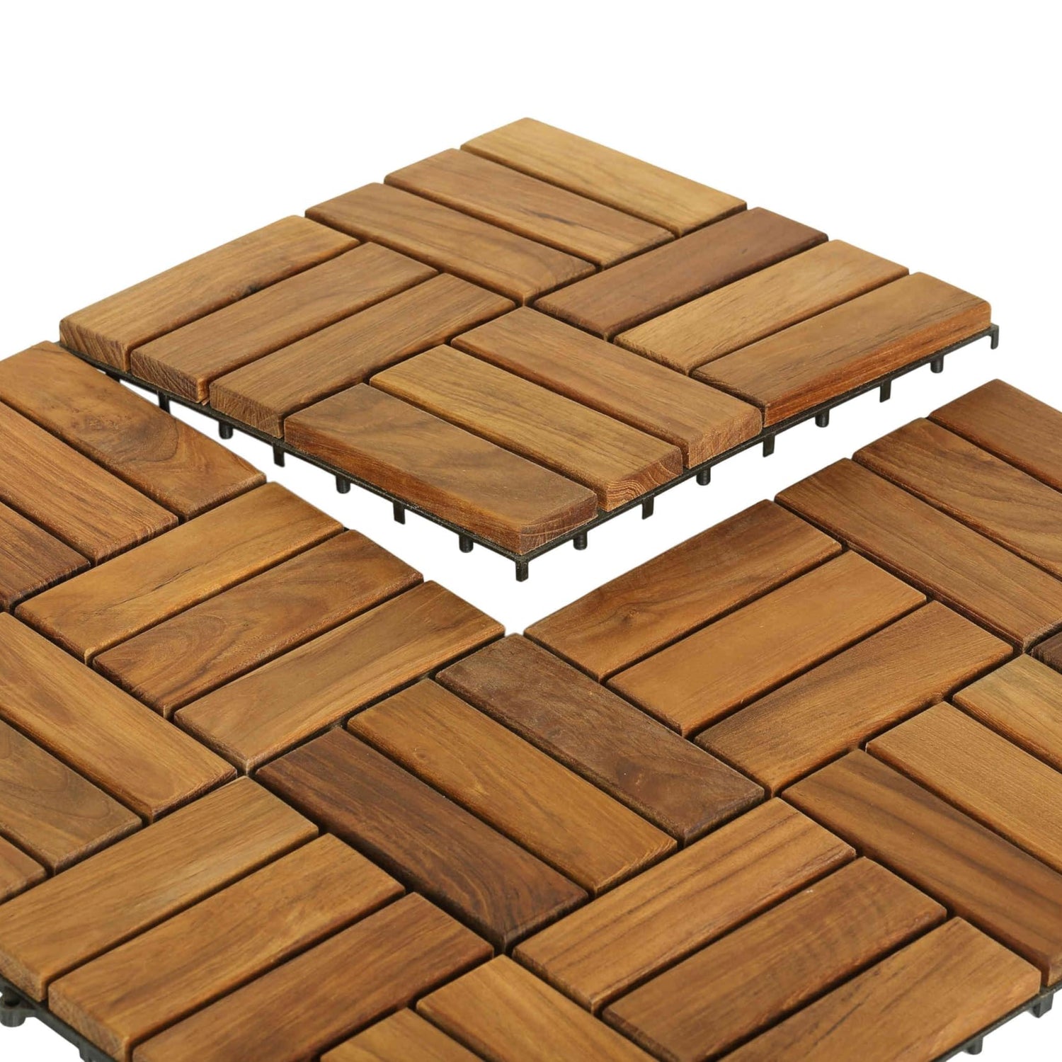 The EZ-Floor interlocking flooring tiles in a solid teak wood with an oil finish . No glue or tools are required - just snap the interlocking tiles together. Can be used for indoor or outdoor settings. Perfect for a entryway, mudroom, deck, terrace, showers, bathrooms, pools or anywhere in between. Solid hardwood - scratches can be sanded out. The teak is responsibly harvested in Indonesia. It's regularly inspected and every shipment receives Indonesian government clearance for compliance with responsible teak harvesting. Floating installation - tiles can be removed and relocated if needed. 10 tiles per box, each tile being a foot by foot in size. Some helpful hints and common projects: -Balcony 10' x 4' is 40 sq ft and will need 4 boxes of tiles -Deck 18' x 12' is 216sq ft and will need 21 boxes of tiles -Walkway 2' x10' is 20sq ft and will need 2 boxes of tiles -Sauna Room 8' x 9' is 72sq ft and will need 8 boxes of tiles -Shower 3' x 4' is 12sq ft and will need 2 boxes of tiles