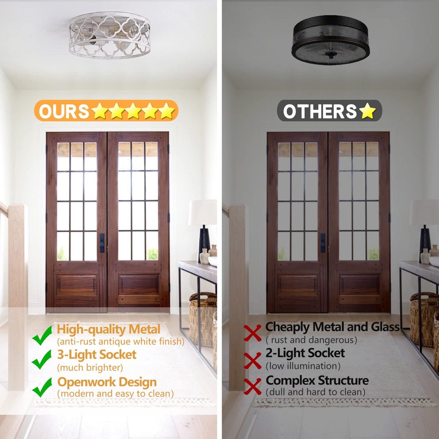 - UNIQUE DESIGN:The light fixtures ceiling mount is themed by simple and unique visual impact.Ceiling lamp adopts antique white finish and symmetric quatrefiol design Offering visual intrigue and a sense of balance at the same time, this dining room light fixture adds a modern, but rustic touch to any home