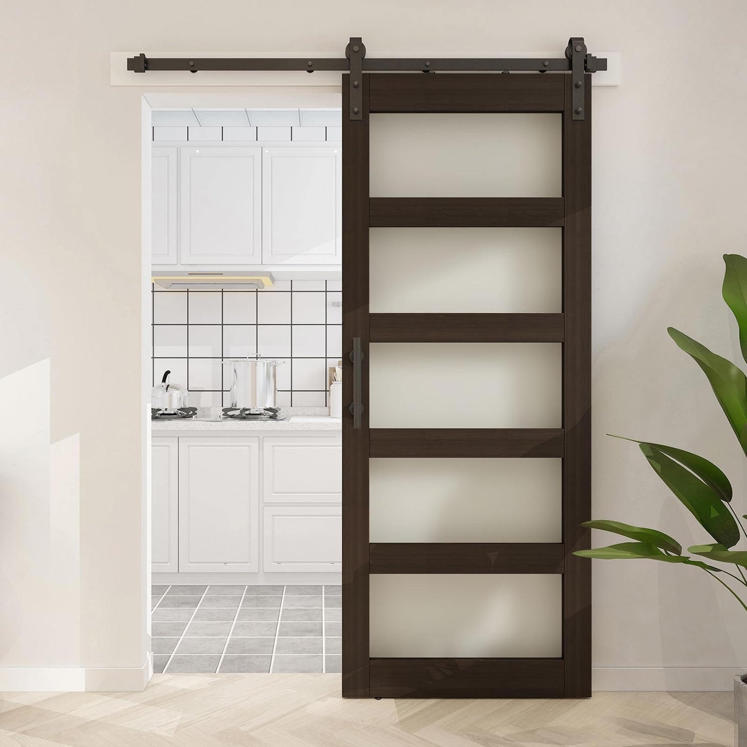 BARNSMITH 30in x 84in Glass Barn Door with 5FT Sliding Door Hardware Kit Included & Handle,5-Panel Frosted Glass Solid Wood Slab with Water-Proof PVC Surface,Pre-Drilled Easy Assembly,Brown