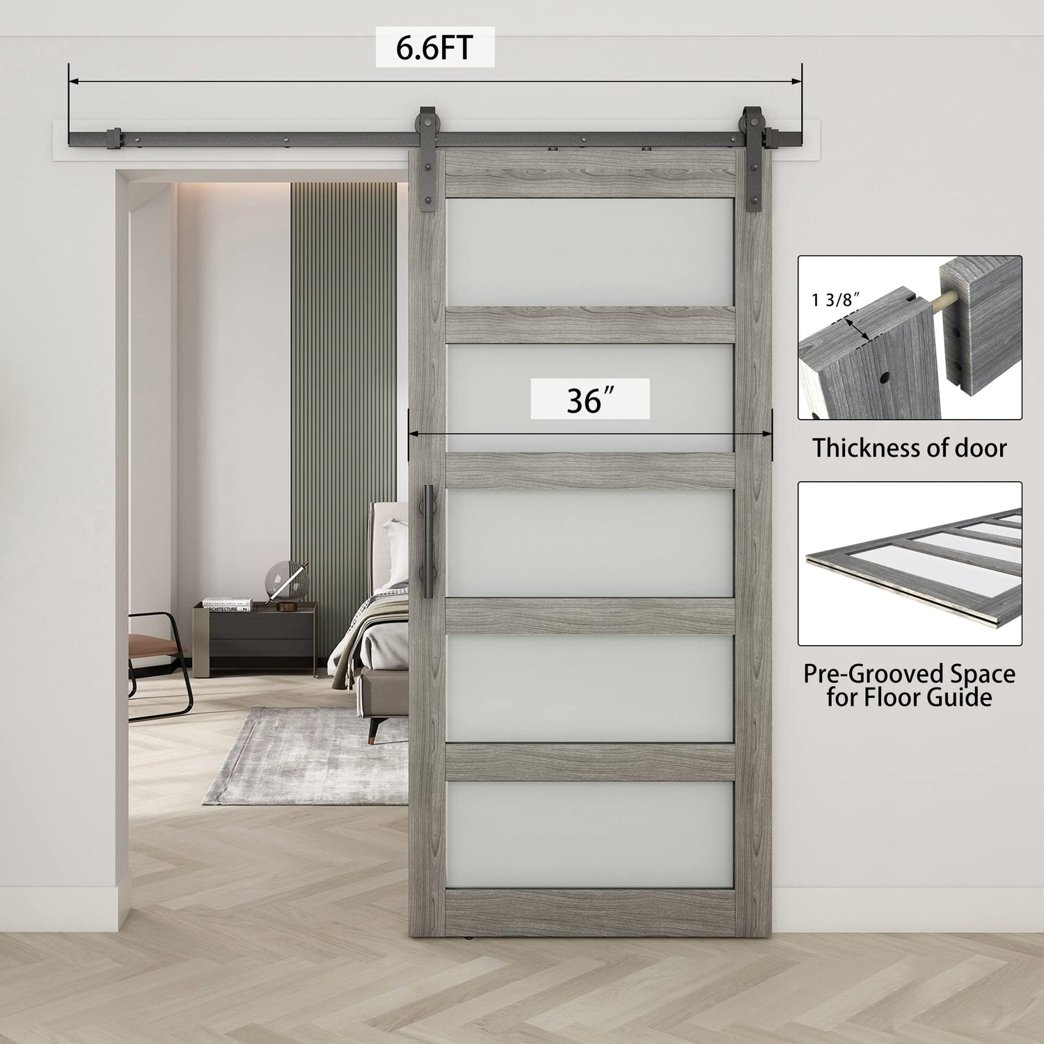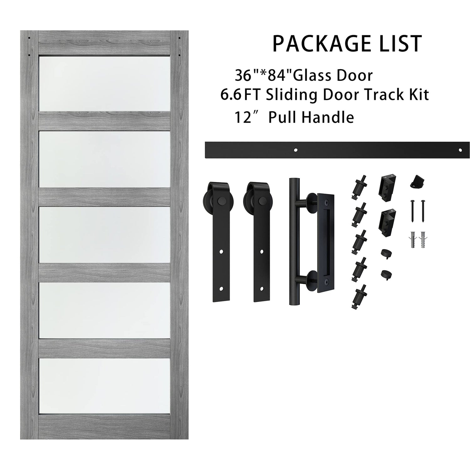 - PACKAGE LIST: 36"(W)x84"(H)x 1 3/8"(THK)door(assemble required),6.6FT black sliding door hardware kit,12" black handle,floor guide,Allen Key,installation manual.
