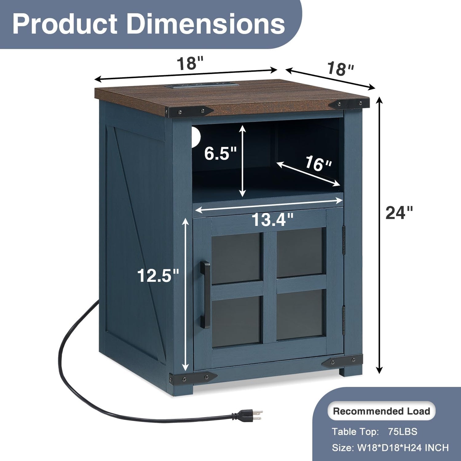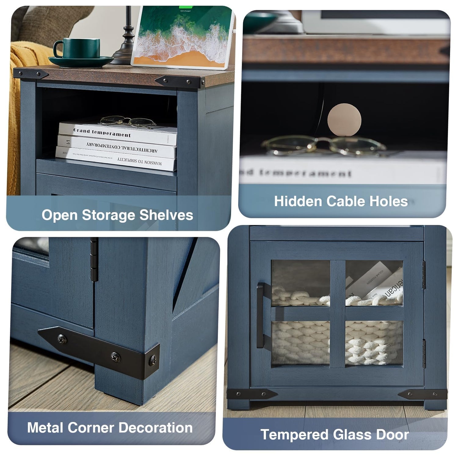 Barnyatoh Farmhouse Nightstand with Charging Station, Rustic End Table with Tempered Glass Barn Door, Wood Sofa Side Bedside Table with Open Storage Shelf for Living Room, Bedroom, Blue