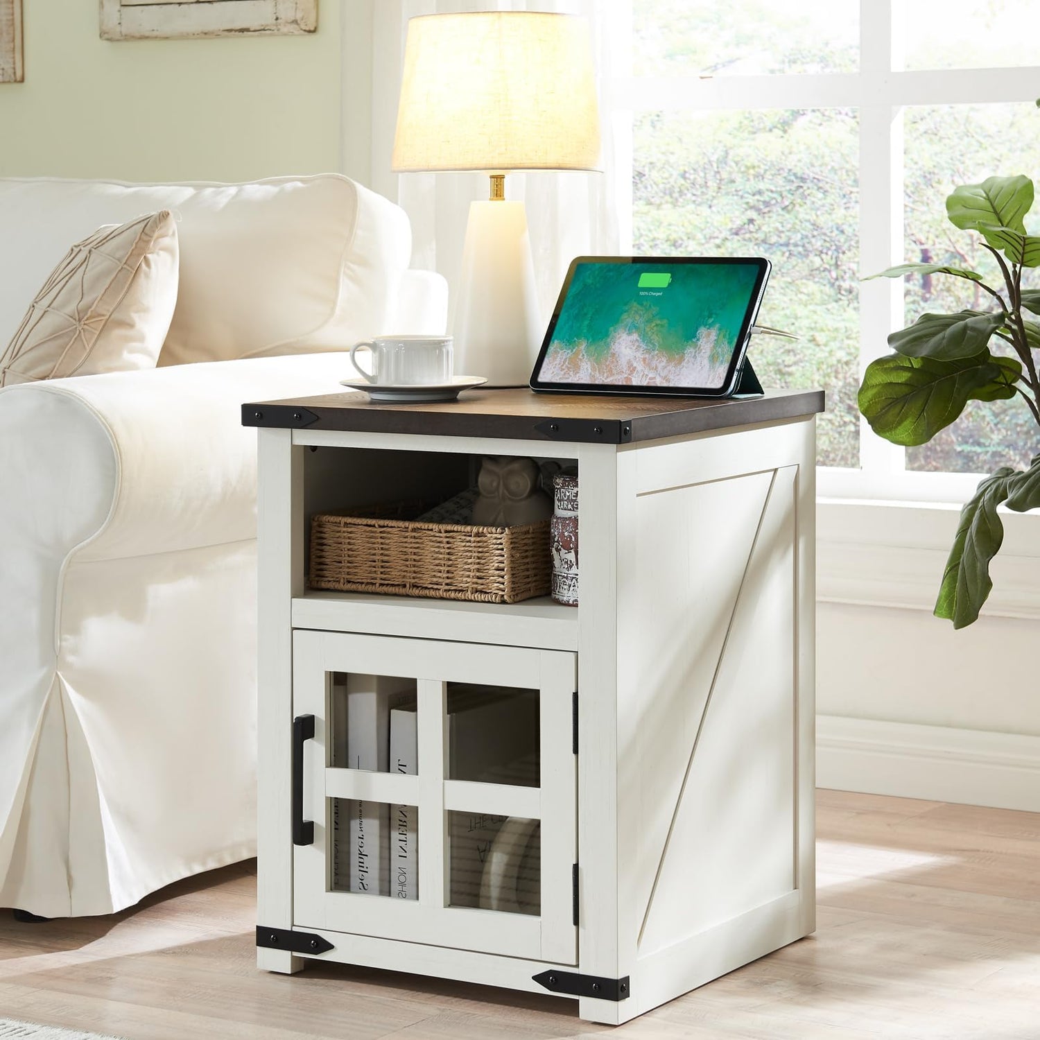 - 3-Tier Storage : Keep life simple with this wood farmhouse side table. An open cubby rest at the top of the unit, which provides a great place to store electronics, small boxes, or other accessories. The bottom of the end table has storage with tempered glass door for holding daily essentials and decors.