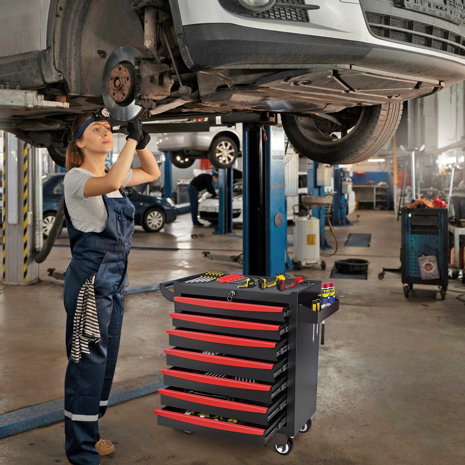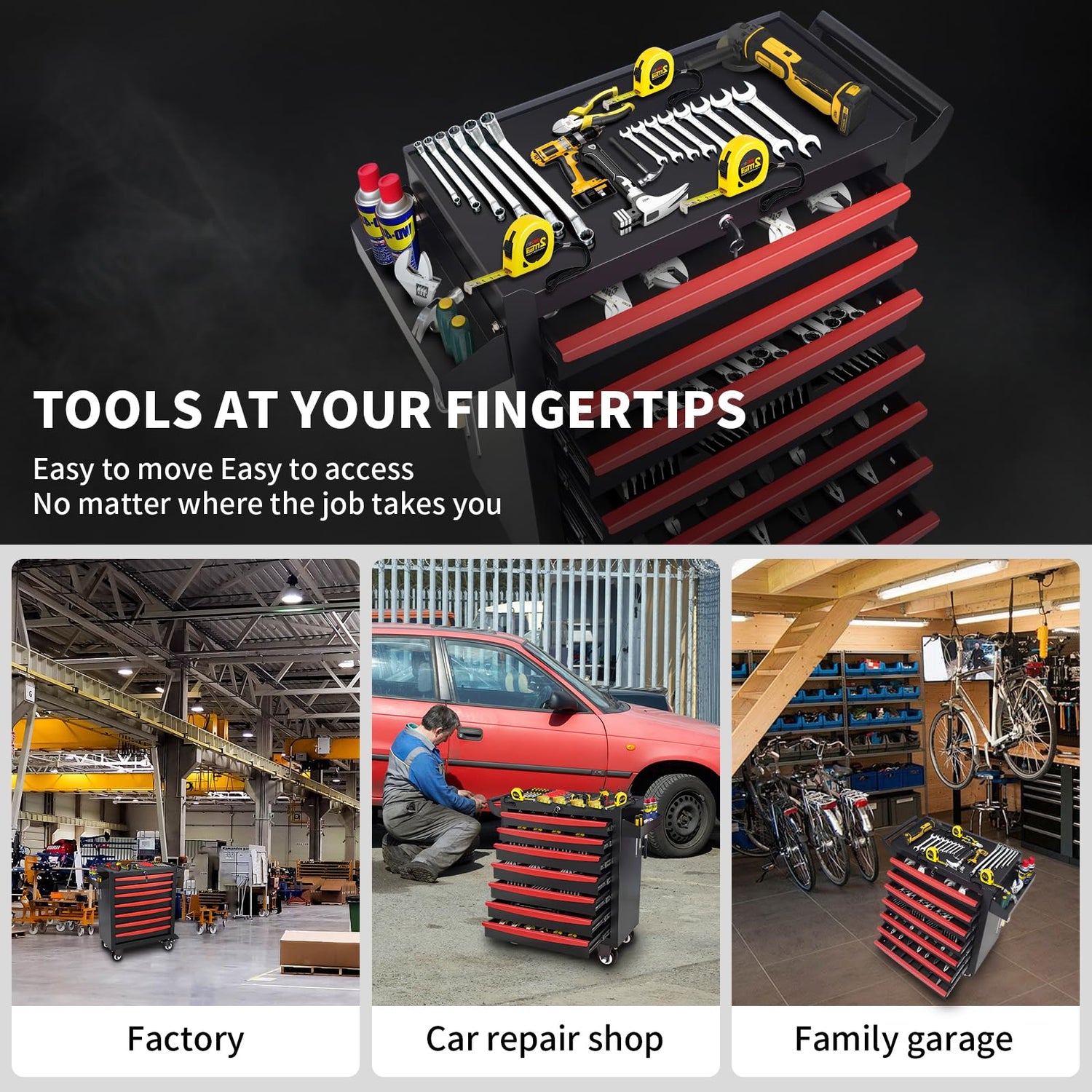 - 【TOOL STORAGE CHEST】The rolling tool box is designed with 7 drawers for storing tools, small equipment and other items. The flat space on the top can also be used as a temporarily workbench to place your tools for your convenience.
