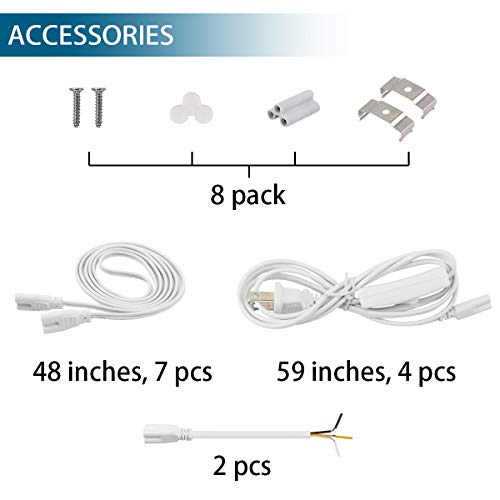 - What You Get - 8 x LED T5 Integrated Fixture, 4 x Power cord with On/Off Switch (59 inches), 16 x Installation Accessories, 7 x Connecting Cords (48 inches), 8 x Small Connectors, 2 x Hardwires