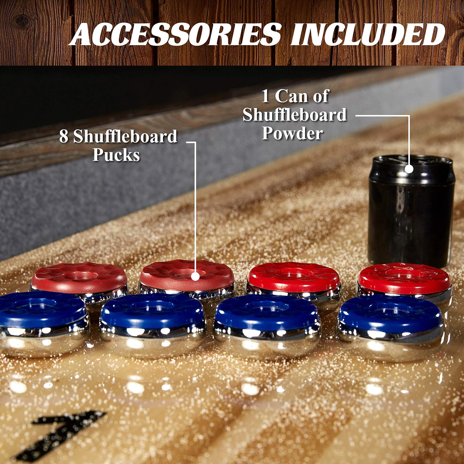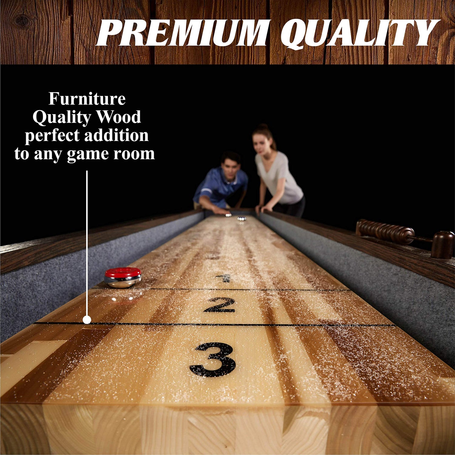 - PLAYING SURFACE: The 12-foot (144”) long table has a durable playfield made of 1.75” (45mm) thick solid wood with a scratch-resistant poly coating providing a smooth and fast puck action for your shuffleboard game experience