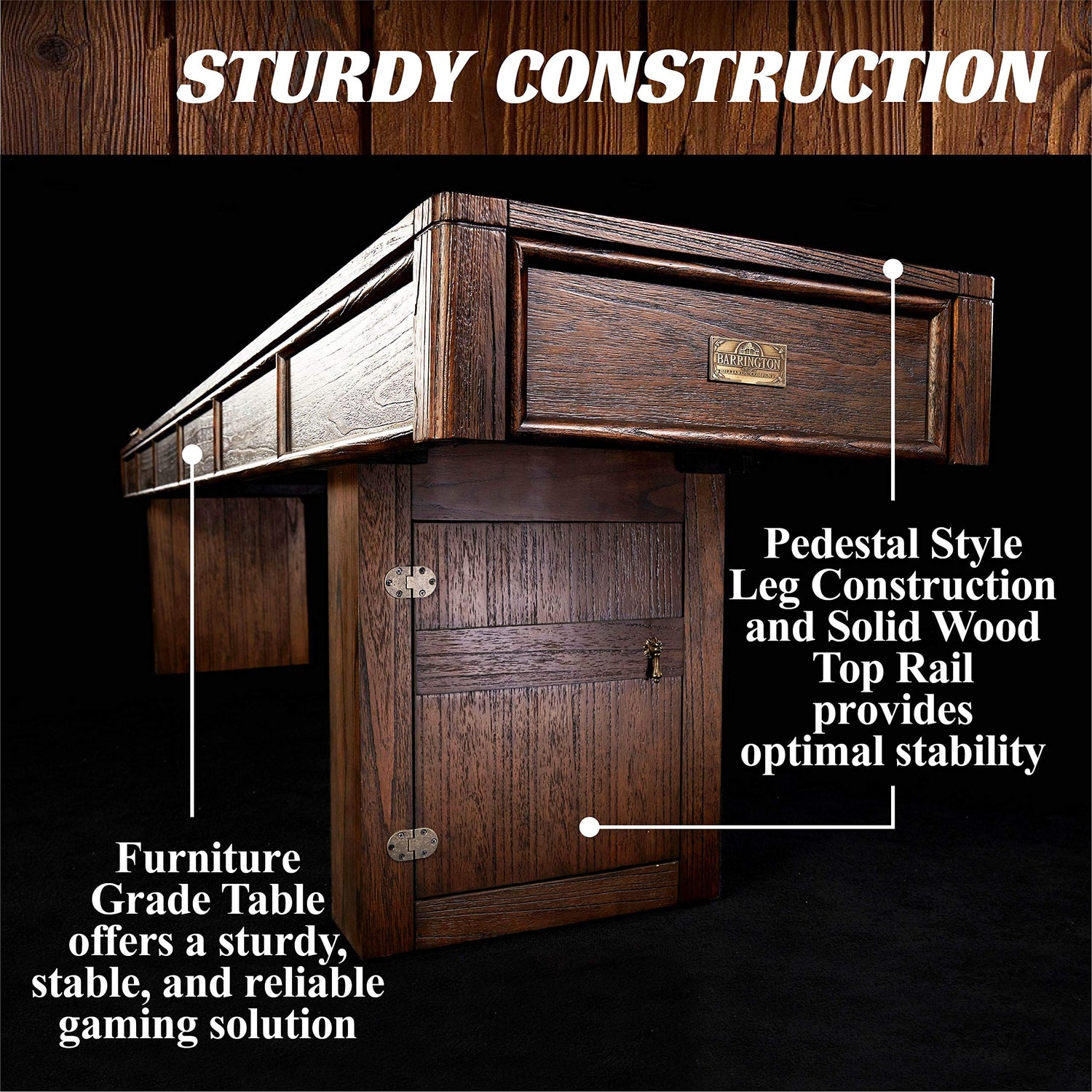 Details: Crafted with furniture quality wood, this shuffleboard table is the perfect addition to any game room. The Barrington 12 ft. Webster Shuffleboard Table comes with everything you need to start playing right out of the box. Deck out your game room and enjoy shuffleboard competitions with friends when you add this beautiful table to your home. SCRATCH RESISTANT, SOLID WOOD PLAYFIELD This table features a solid wood playfield with a premium 1 3/4 inch scratch resistant coating, which will help to ensure smooth puck action. The puck easily travels down the board without unwanted interferences, knocking your puck off target and into the alley. STURDY CONSTRUCTION Reliable pedestal style leg construction and solid wood top rail provide optimal stability. Crank up the competition without fear of upsetting the table or knocking pucks off their scoring spots. Unlike cheaper, flimsier options, this furniture grade table offers a sturdy, stable and reliable gaming solution. HIDDEN STORAGE Hidden storage cabinets are built into the pedestal style legs to better organize and store your accessories. TRADITIONAL BEAD STYLE SCORER AND CARPETED GUTTERS The nostalgic wooden bead style scorers will help to keep track of the action in style. Carpeted walls and gutters not only look great but also help to protect the playing surfaces and reduce any unwanted noise.