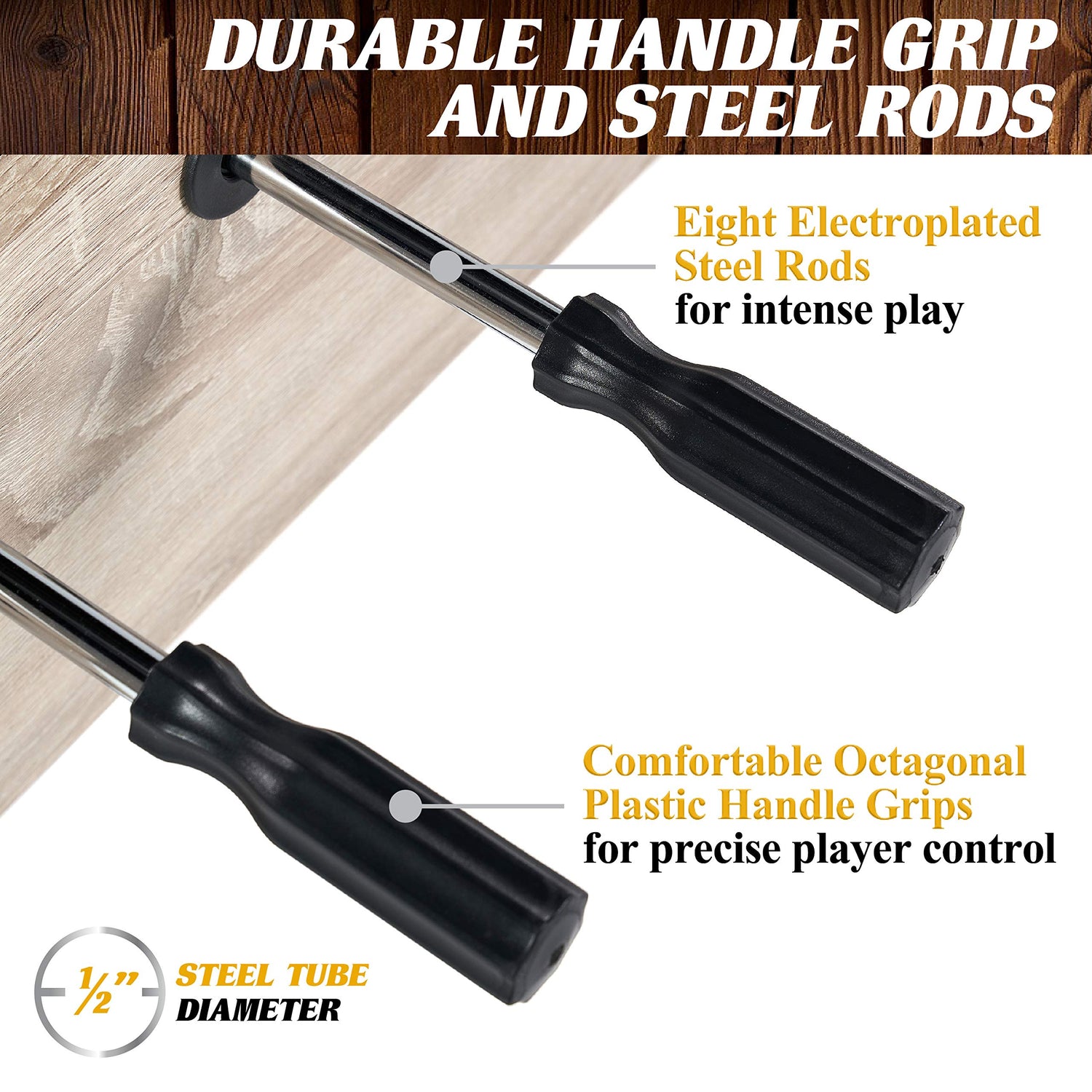- FAST-PACED PLAY: The 1/2” steel rods on this foosball table glide over plastic bearings and have a hollow design with octagonal non-slip handles for intense play. Sideline ramps keep the ball moving on PVC laminate, 9mm thick MDF playfield.