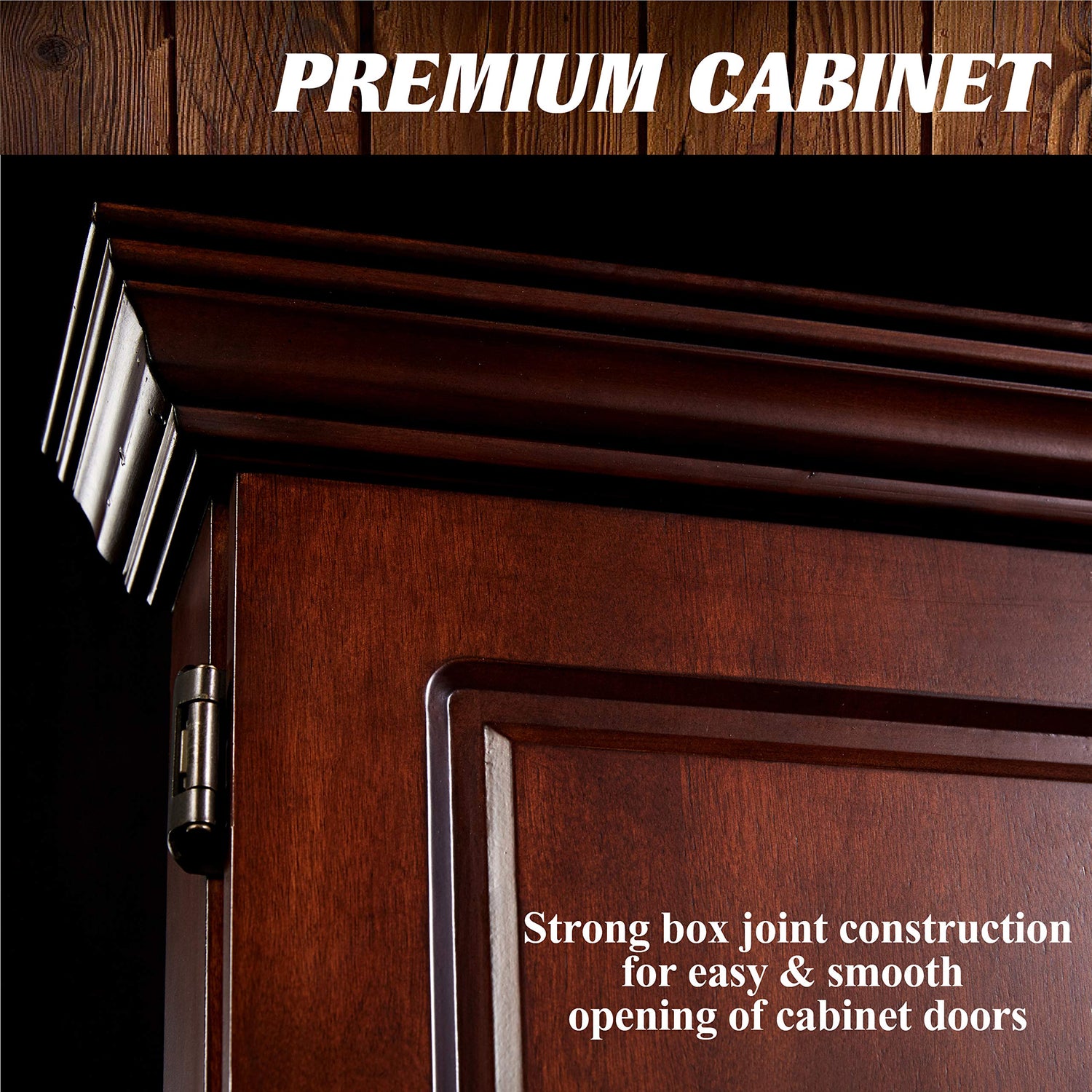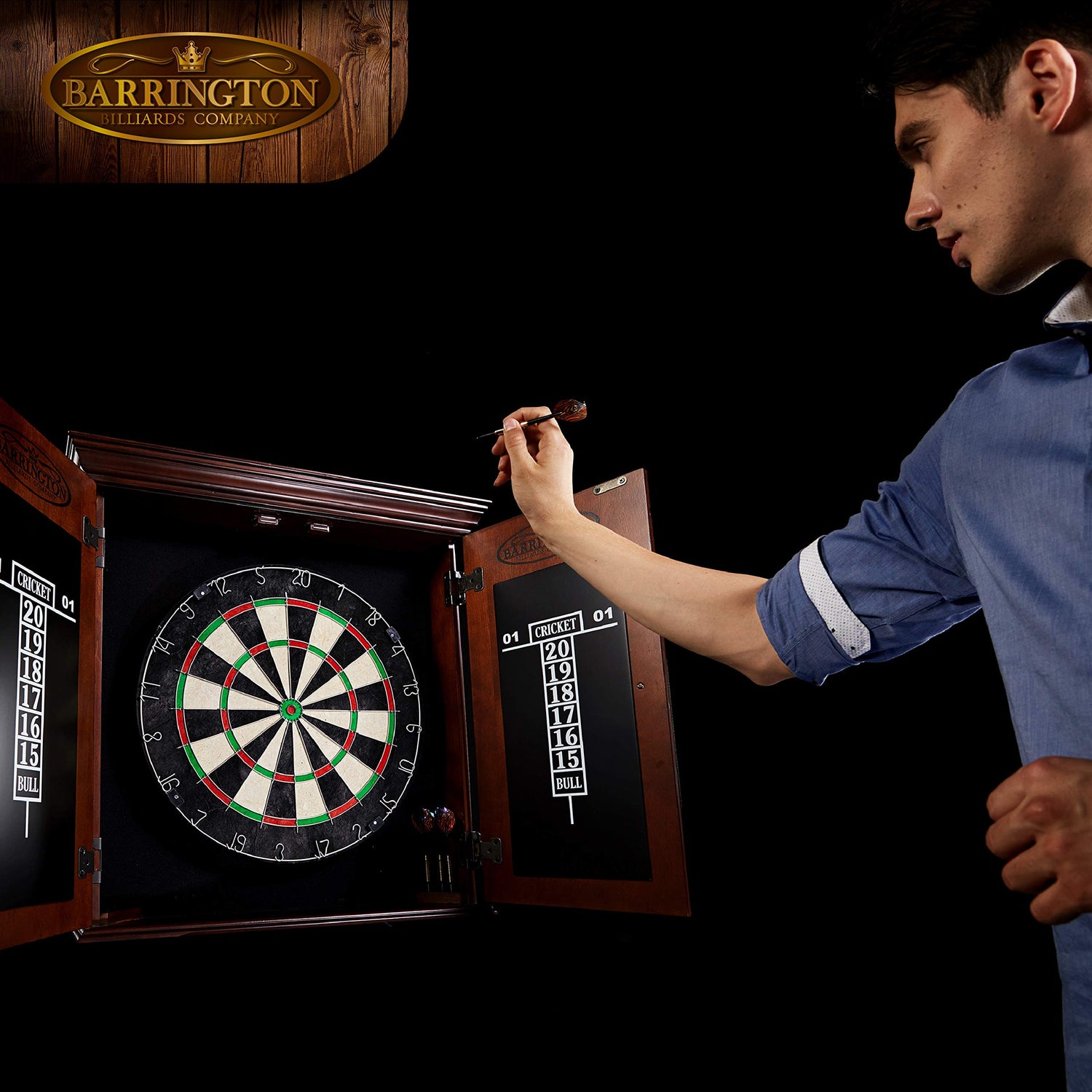 Details: Accessories included: Includes all the essential accessories and mounting hardware required for a regulation dartboard match, including a wall mounting bracket, 6 steel tip darts and flights, score board and 1 marker. Premium cabinet: This custom dartboard cabinet case can hang on any wall in a home, rec room or pub area. The strong box joint construction helps the doors to open smoothly and easily. The premium hinges prevent cabinet doors from slamming, which protects your dartboard and cabinet from wear and tear. Traditional dartboard cabinet design: The traditional dartboard cabinet design is the perfect accessory for any game room, home bar, break room or man gave. The dartboard cabinet also matches perfectly with Barrington billiards products.