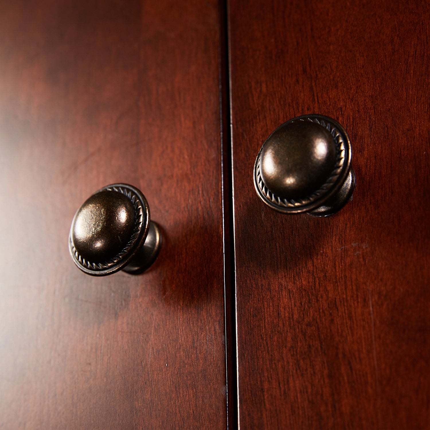 - STORAGE & MOUNTING: Hardware is included to mount the cabinet to most indoor walls and to attach the dartboard to the cabinet. The hinged wood veneer doors with painted finish include magnetic locks and storage is built into the corners for 6 darts.