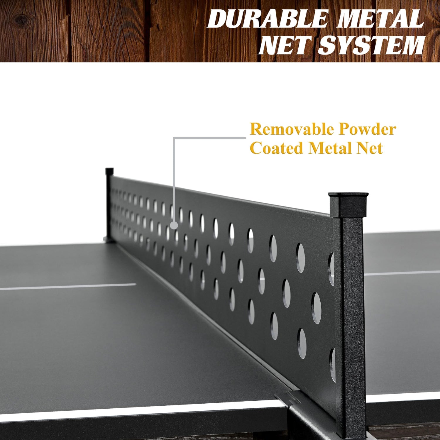 • REMOVABLE METAL NET: The 18mm playfield, coated with a black PVC laminate over engineered wood, ensures a consistent and reliable ball bounce. This table has an upgraded metal net system that’s removable for convenience and powder-coated for durability.