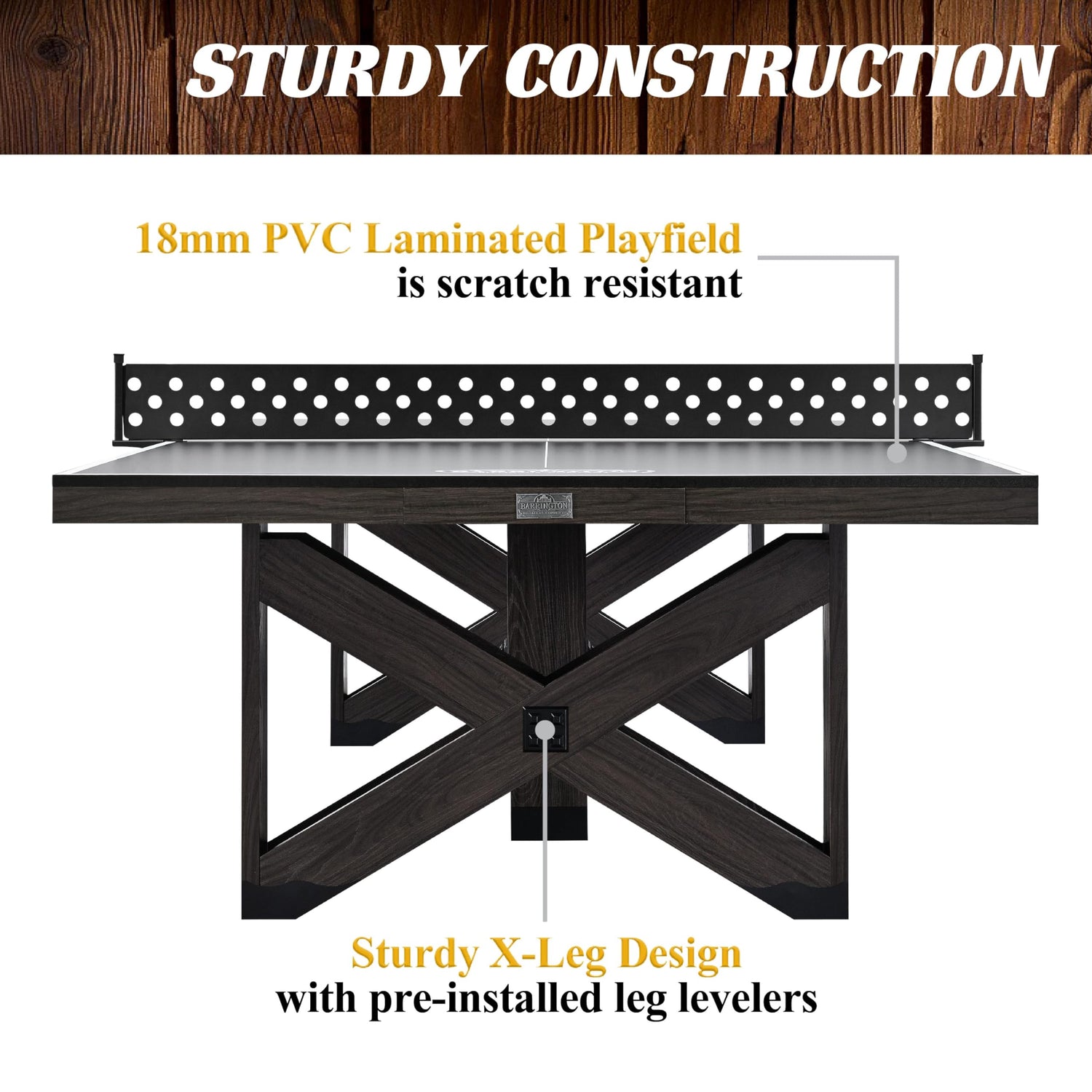 • X-SHAPED LEG DESIGN: The 3 sturdy legs are made of engineered wood with a dark wood laminated finish and x-shape. The table legs attach securely with hand-tightened wing bolts and have pre-installed 1.5” leg levelers to help keep the playing surface even.