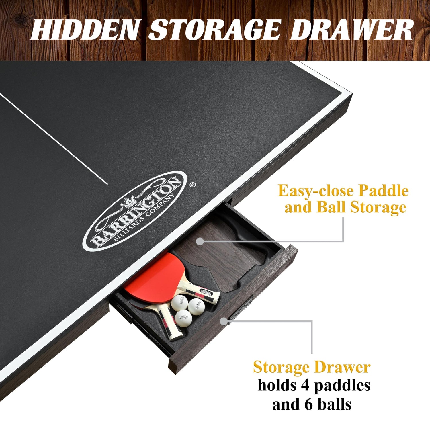 Details: This Barrington Fremont collection tennis table requires NO TOOLS for assembly and includes easy-to-follow step-by-step instructions guiding you through the process. This elegant furniture-quality laminated wooden tennis table will make a striking addition to your game room. It is a regulation table that measures 108 inches long x 60 inches wide x 30 inches high with an 18mm scratch-resistant laminated playfield. The 3 sturdy legs are made of engineered wood with a dark wood laminated finish and x-shape. The table legs attach securely with hand-tightened wing bolts and have pre-installed 1.5” leg levelers to help keep the playing surface even. The recommended room size for this table is 17 feet x 10 feet for easy movement around the table. Included with this table are 2 high-quality wooden paddles each with 2mm of sponge and 1.5mm of rubber along with 3 ABS 3-star 40mm regulation-size table tennis balls. A hidden easy-close storage drawer holds up to 4 paddles and 6 balls.