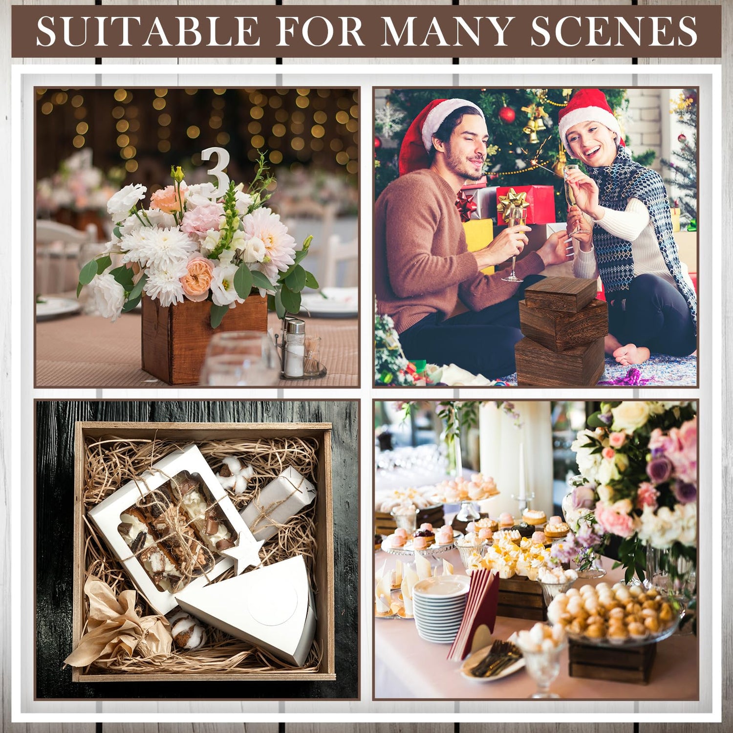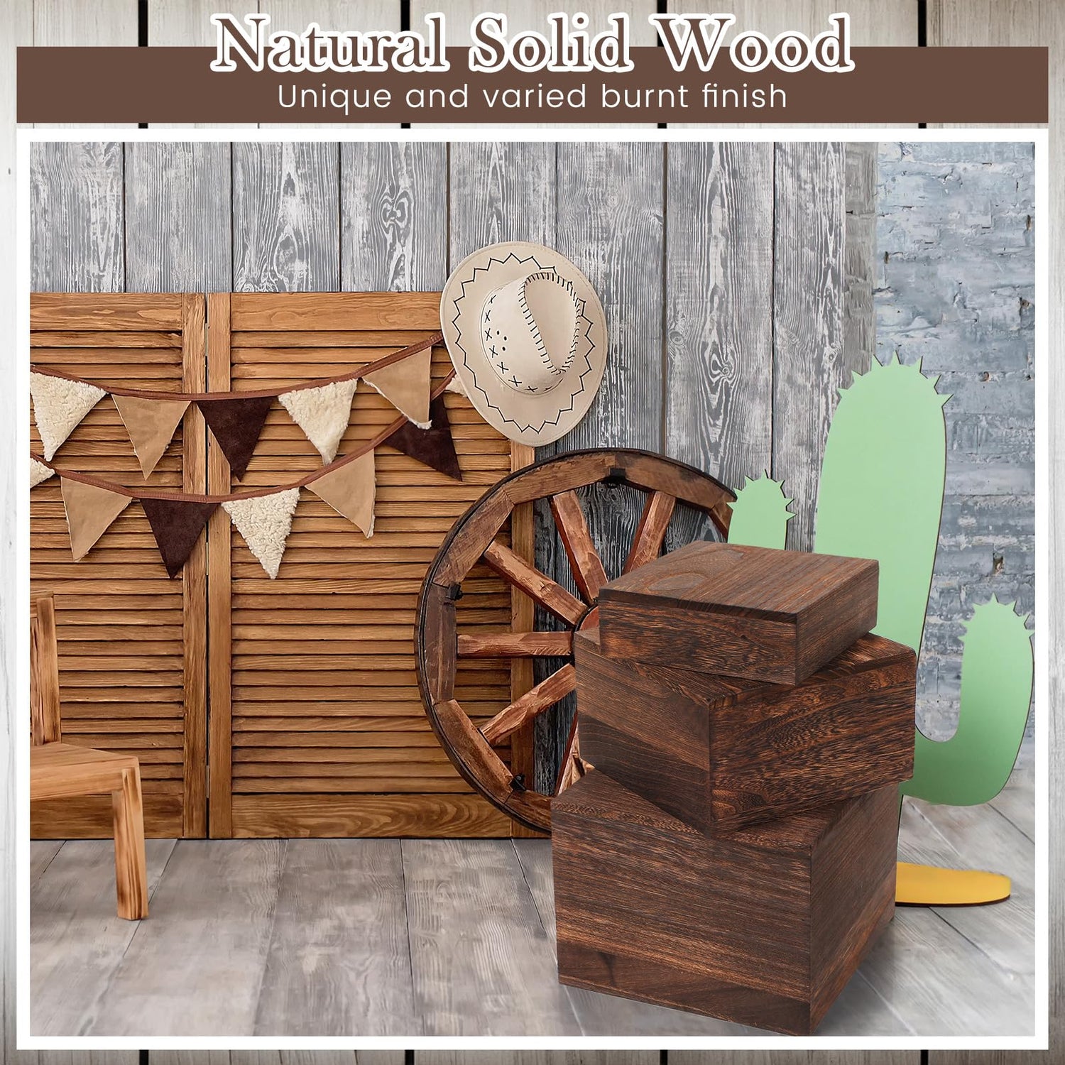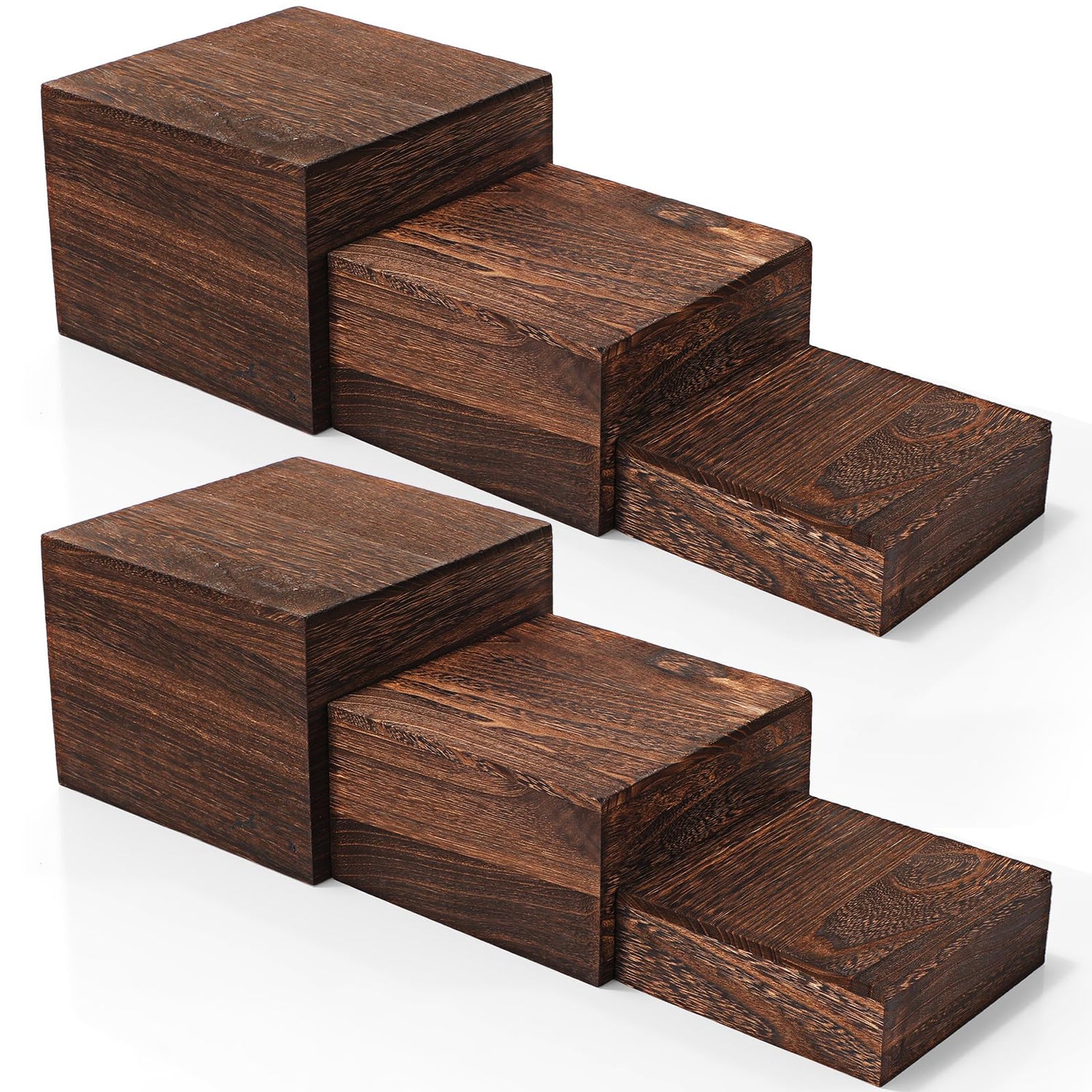 - Rustic Style: the wooden riser exudes a rustic charm, thanks to their appealing burnt wood color; Suitable for occasions that call for a rustic or country themed setup, these stands fit right into a barn wedding reception; Adding to the vintage appeal, the burnt wood color gives these stands a charmingly worn, well loved appearance