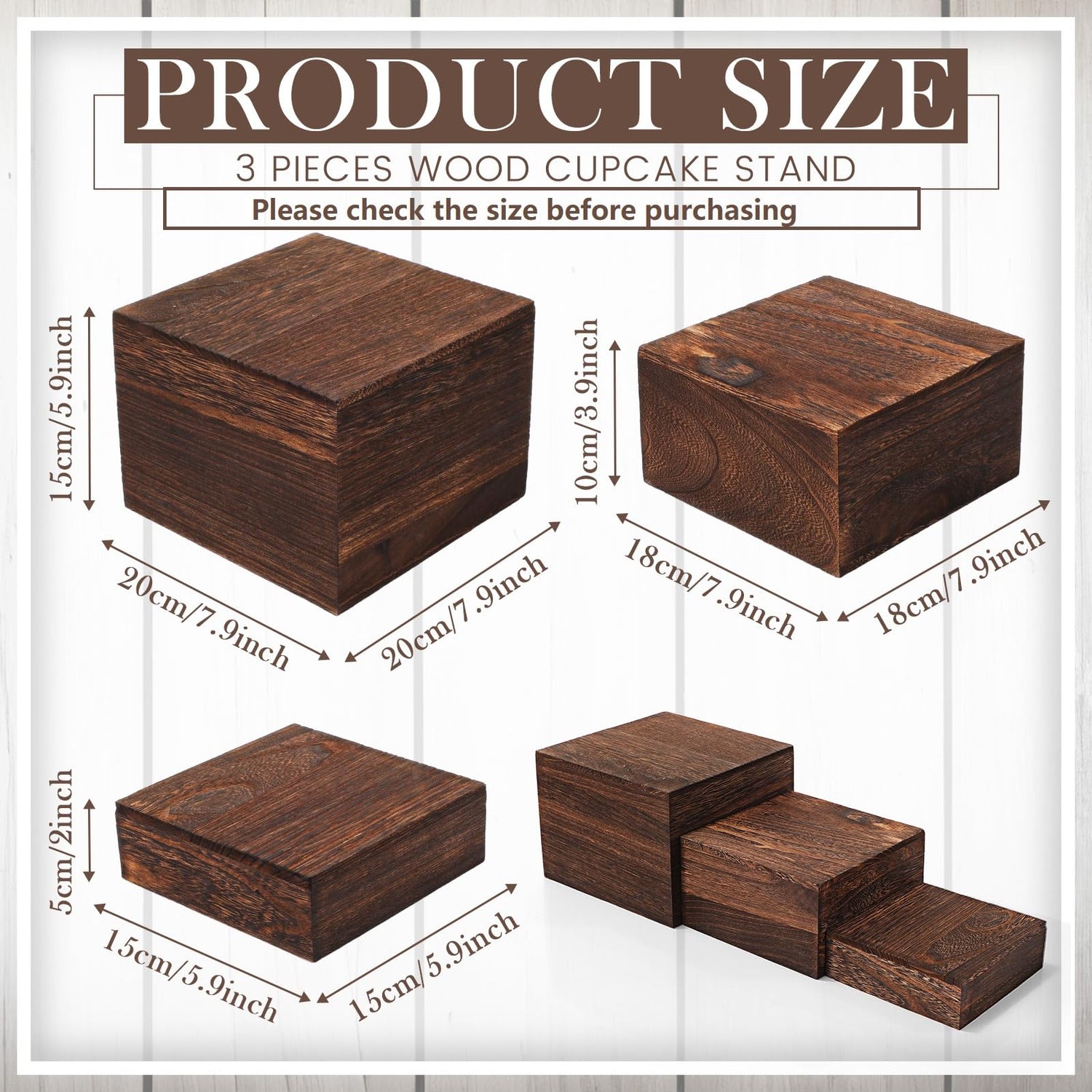 - Variety in Size: the package consists of 3 sizes, roughly about 8 x 8 x 6 inches, 7 x 7 x 4 inches, and 6 x 6 x 2 inches respectively, providing flexibility for your various display needs; Whether you are showcasing a tower of cupcakes for a party or promoting your delightful baked goods at a storefront, these rustic dessert stands are compatible with your different requirements