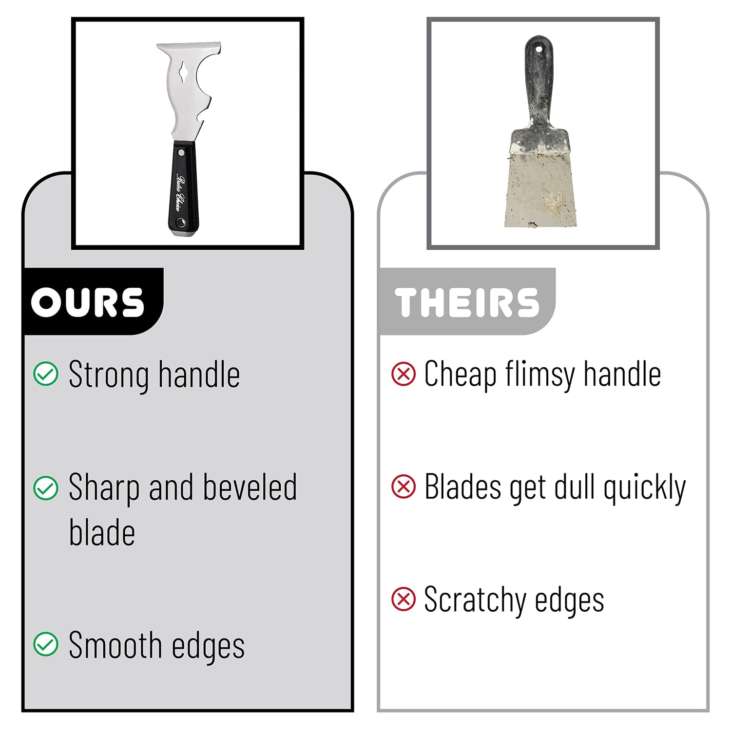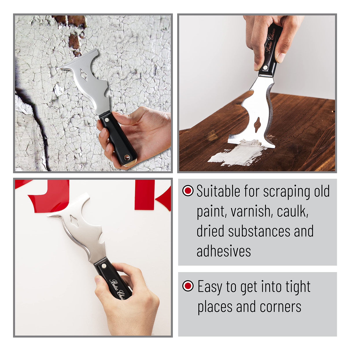 Bates paint scraper tool 10 in 1 easy to use and convenient. A must have tool in your home, Rust-resistant steel blade with wood grip designed . This is a multi purpose tool and is ideal for home improvement projects like applying joint compound, puttying windows, scraping paint, removing loose putty, removing loose paint, removing vinyl or paper wall covering, Patching dents cracks holes in plaster with soft grip designed to last for long jobs without hand discomfort. Package includes: 10 in 1 paint scraper tool