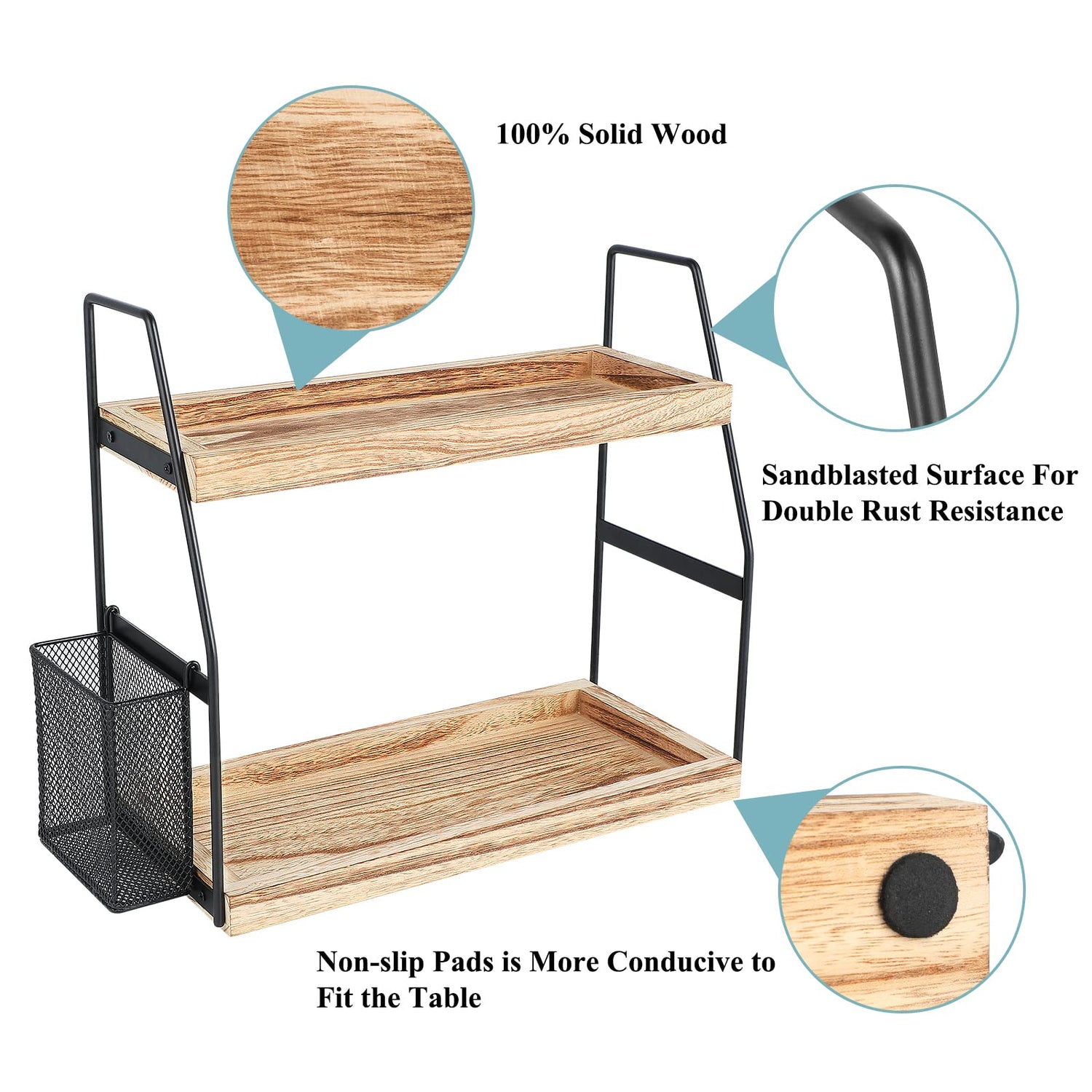 - STURDY: Our bathroom countertop organizer is made of 100% solid wood and the waterproof coating on the pallet’s surface can prevent water erosion. The brackets on both sides are made of thickened steel for better load-bearing capacity, and the frosted coating achieved through sandblasting ensures waterproof and rust-resistant propertie.