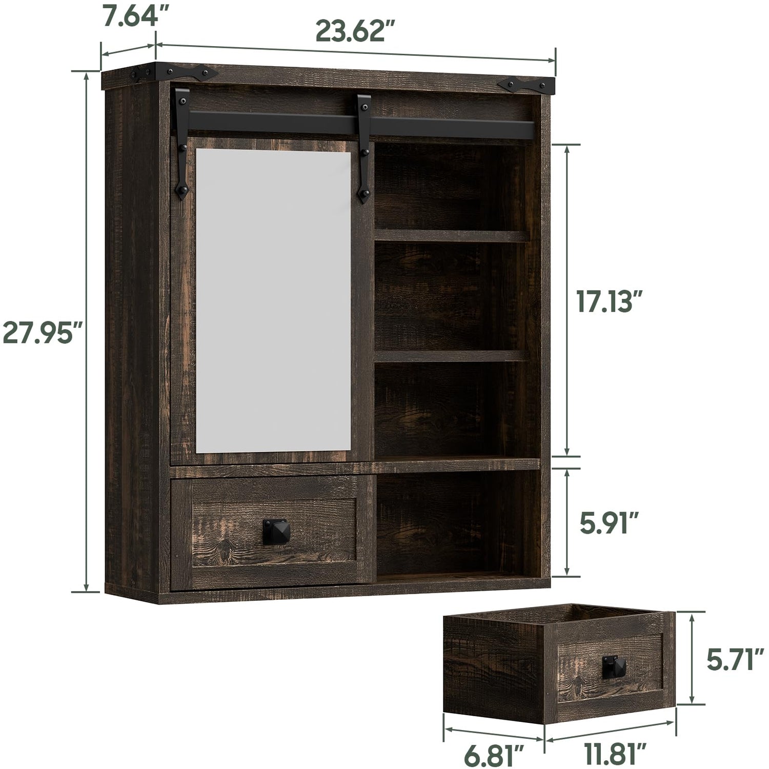 - FARMHOUSE MEDICINE CABINET WITH REMOVED DRAWER: Classic farmhouse aesthetic. The weather natural wood grain makes this cabinet a striking focal point in your home. We have also added an adjustable position or standalone drawer, which enhances both appearance and usability.