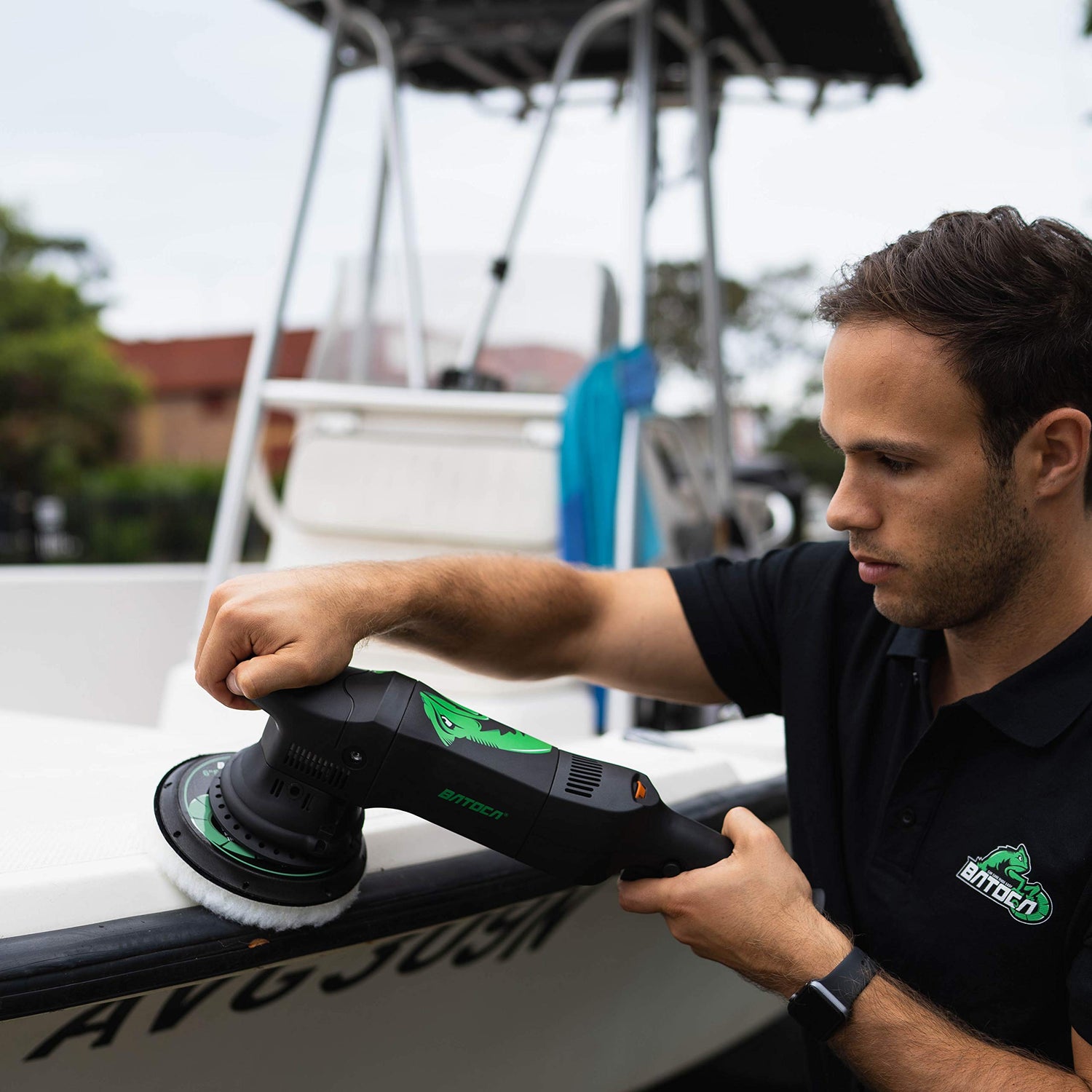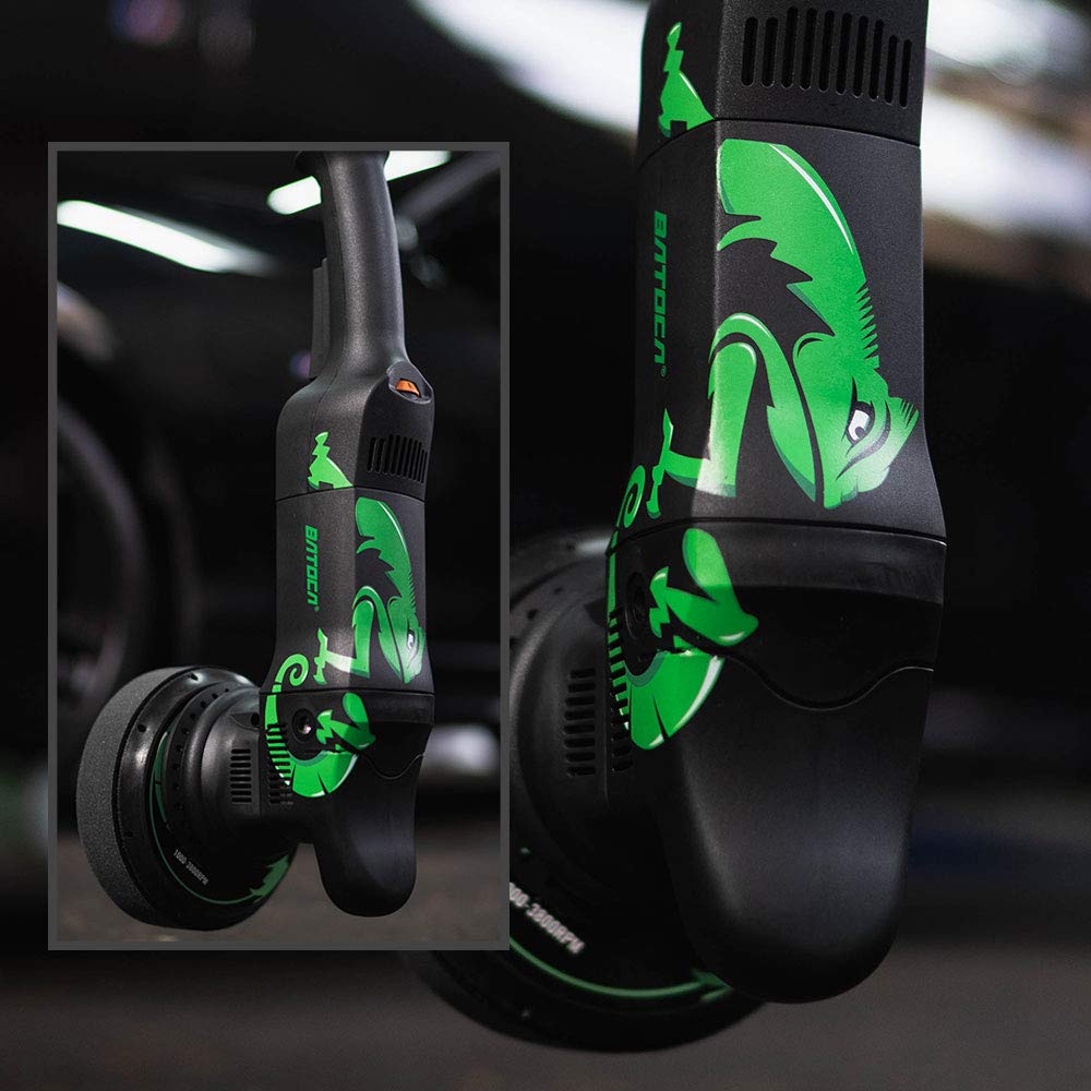 • 🚗【Unique Design & Ergonomic Design】BATOCA professional design team is dedicated to creating something new and different car buffers and polishers. Unlike regular buffer polisher, a green chameleon encircles the body of our BATOCA DA polisher. It is unprecedented cool and helps to make your car cool and shiny. Comfortable front grip, curved body sense handle is not easy to fatigue, more accurate operation.
