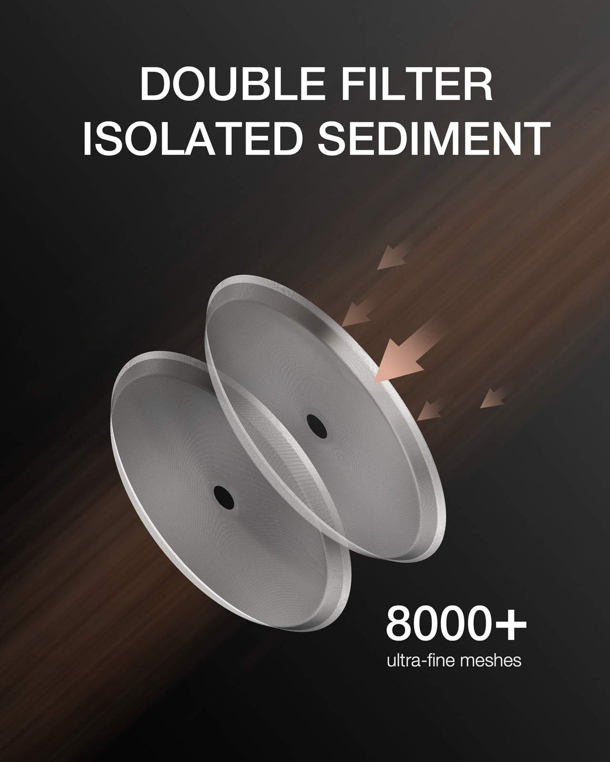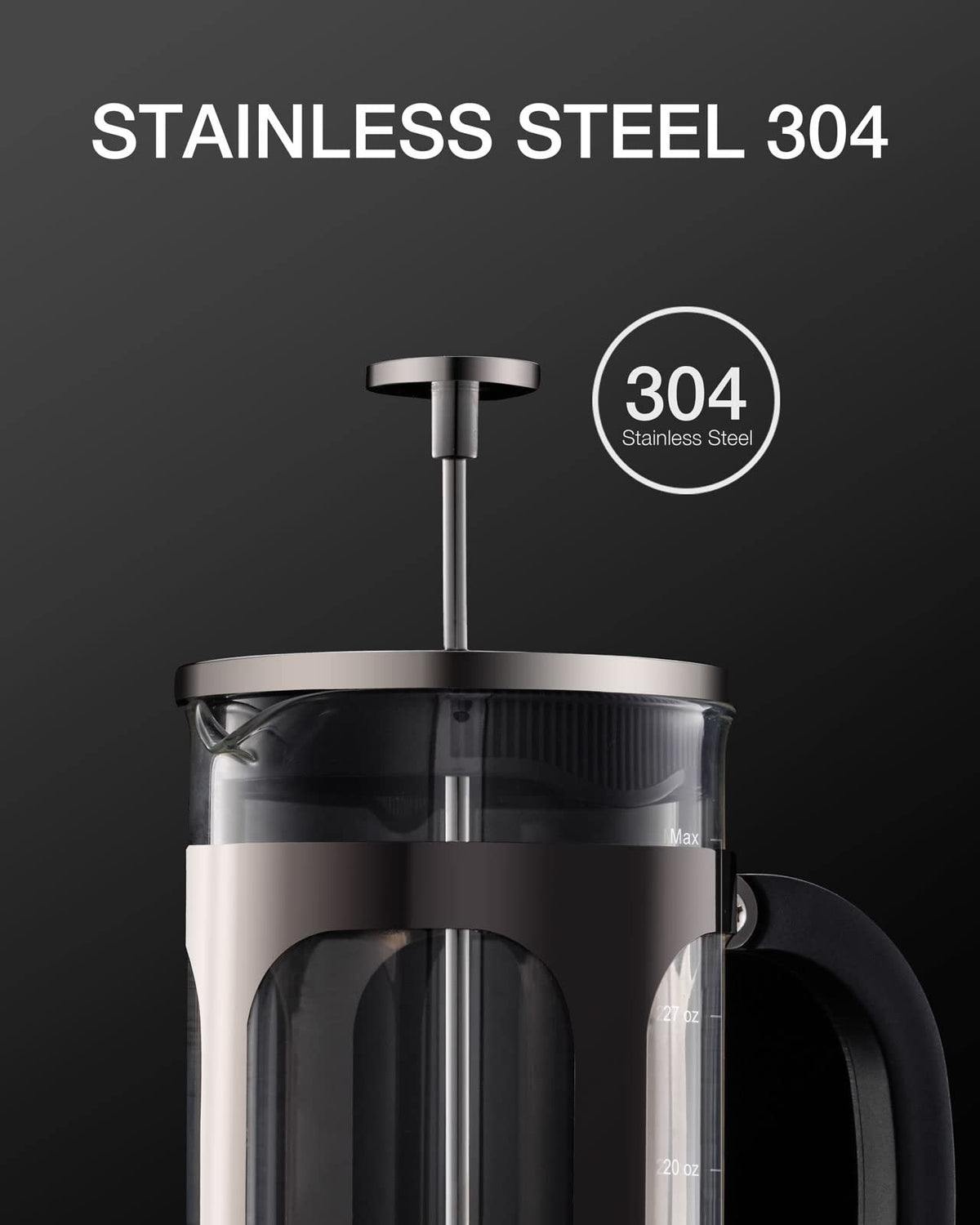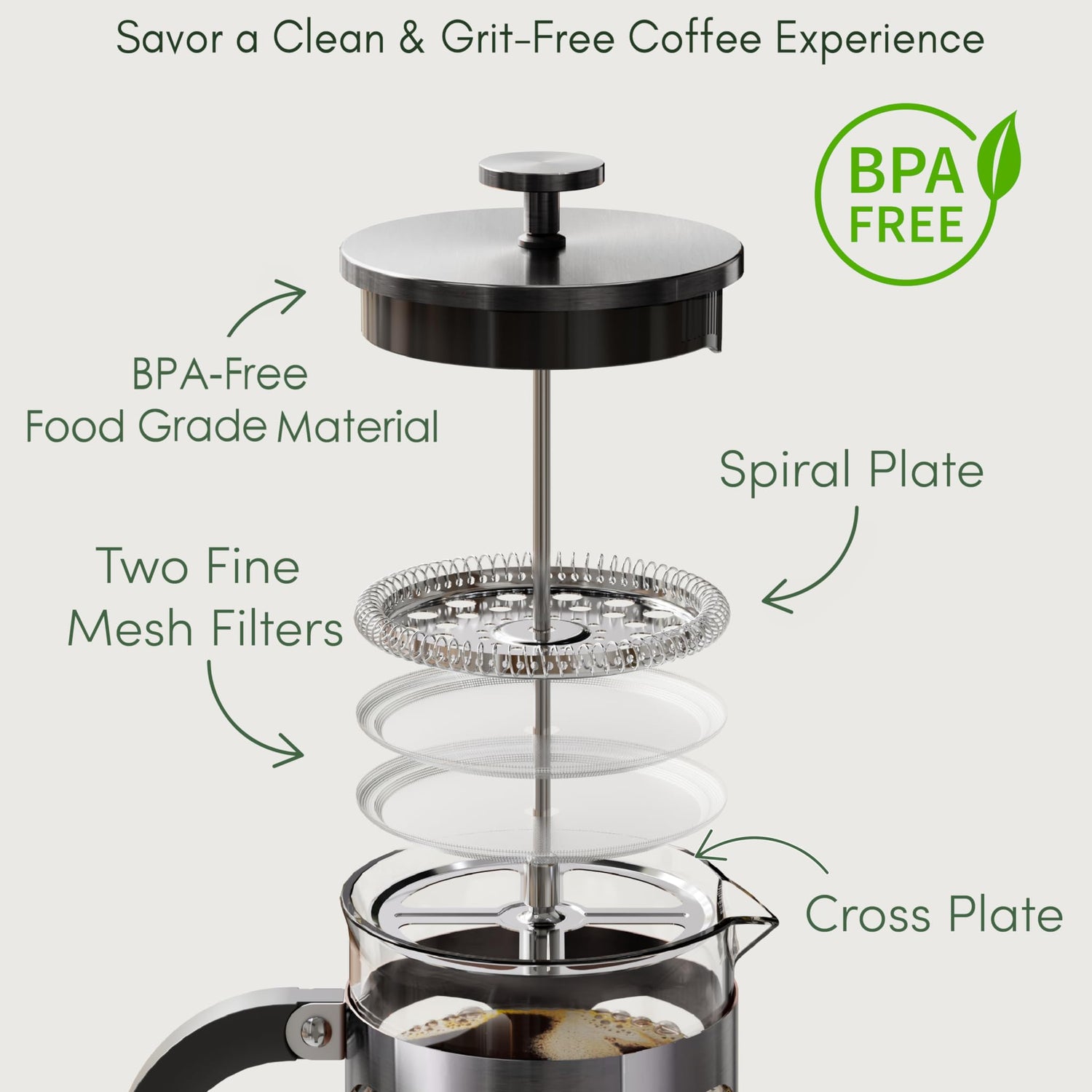 - 4-Level Filtration: Our French press uses a 4-level filtration system comprising a metal mesh filter, spring disk, metal cross plate, and a final mesh screen to ensure sediment-free coffee