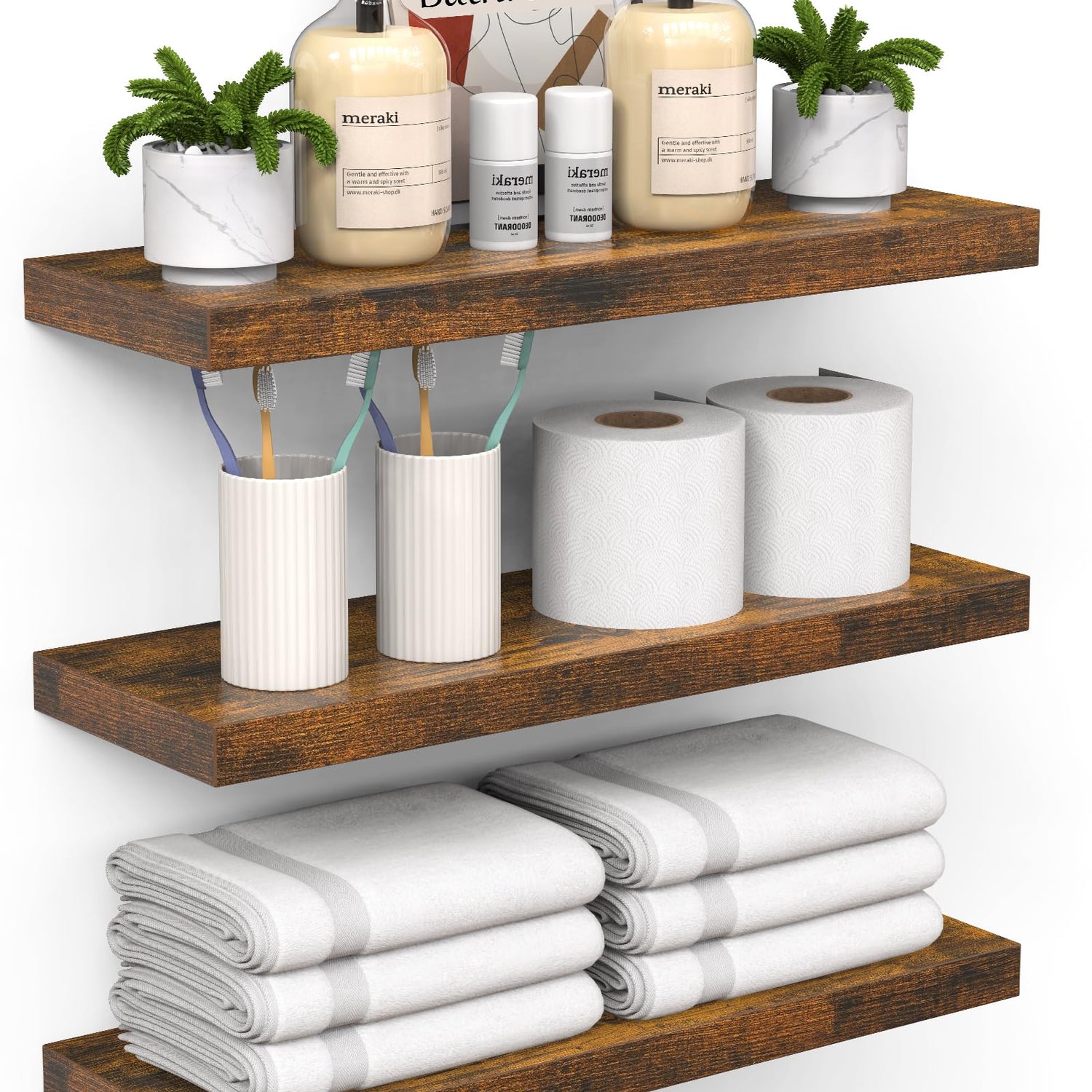 BAYKA Floating Shelves for Wall โ Bathroom Shelves Rustic Wood with Metal Brackets for Bathroom, Bedroom, Kitchen, or Living Room Decor โ Rustic Brown, Set of 3, Sturdy Storage with 22lb Capacity