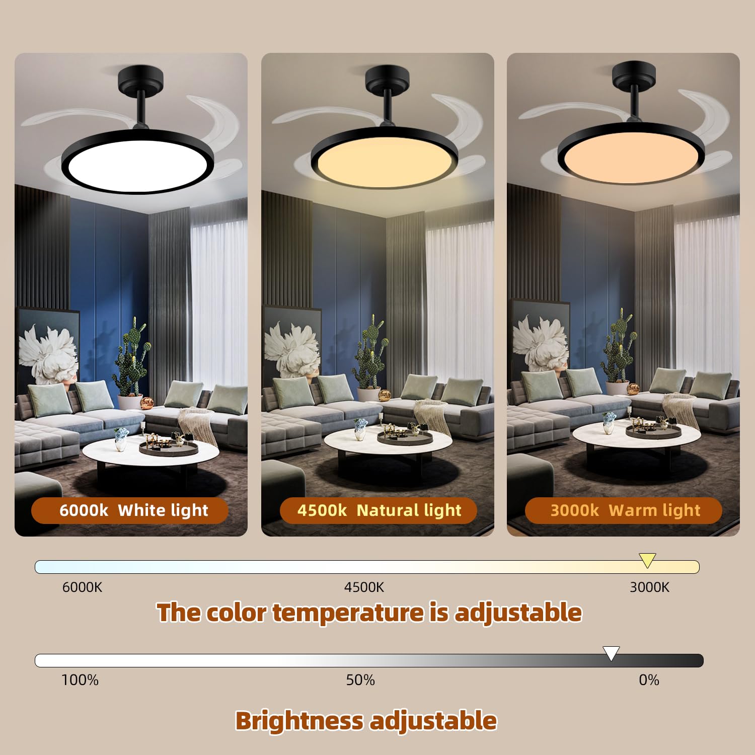 - [Three color modes] This is a three-color changeable fan light, change the color of the ceiling fan light through the app, at the same time, the brightness and color temperature can be adjusted through the APP.