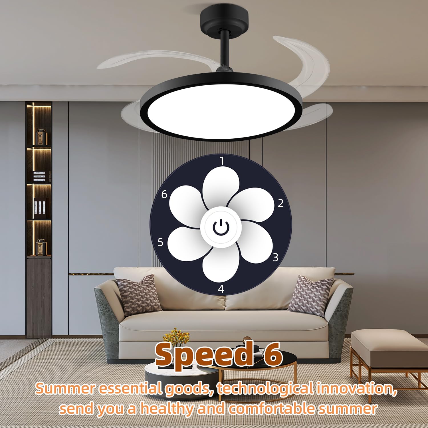 - [6-Speed Reversible Retractable Ceiling Fan] Retractable Ceiling Fan, thickened acrylic transparent 4-leaf retractable blades, the 6-speed fan supports forward and reverse rotation. the fan blades are rotating forward to provide you with strong cold air in hot summer, and in winter Ceiling fans reverse to provide fresh air throughout your home.