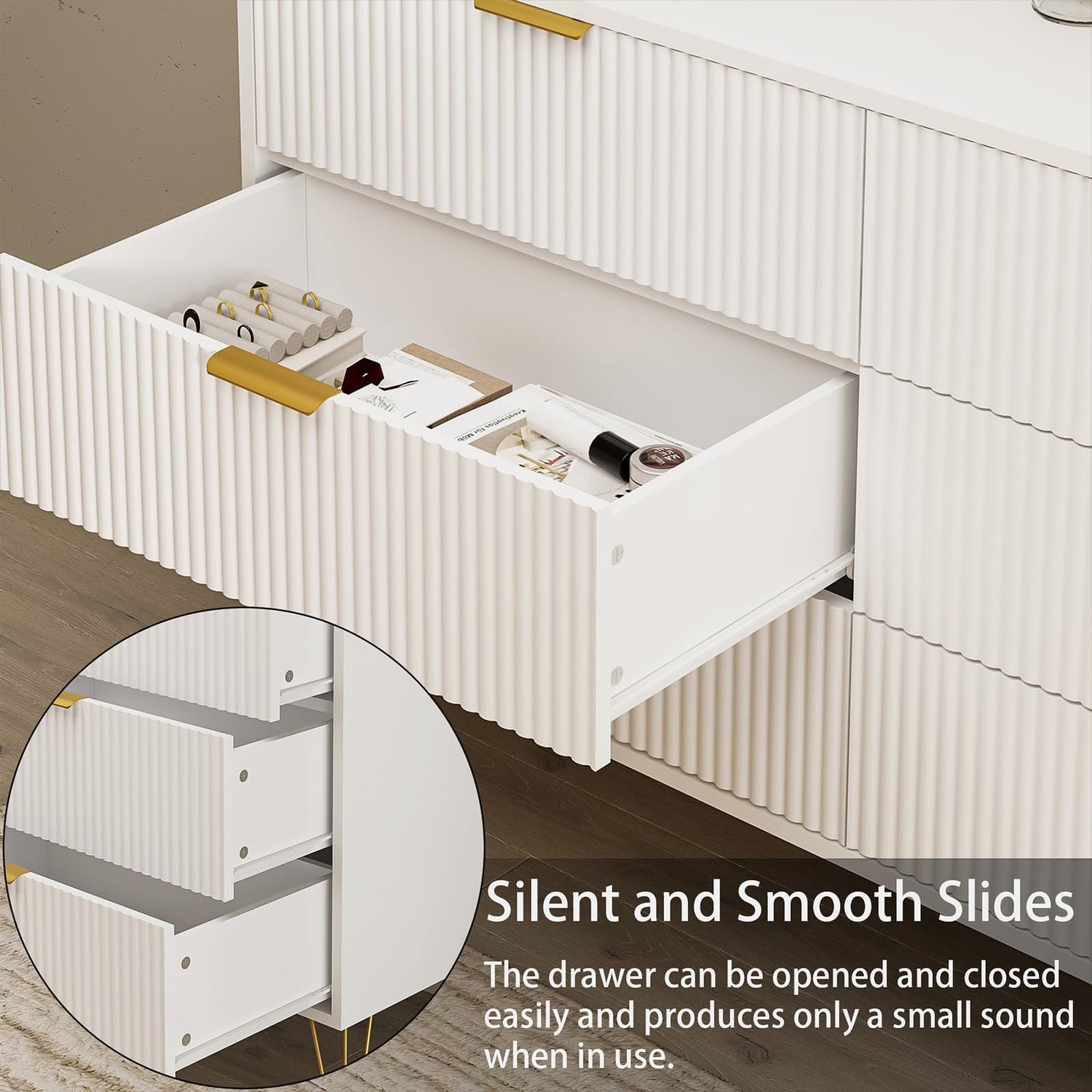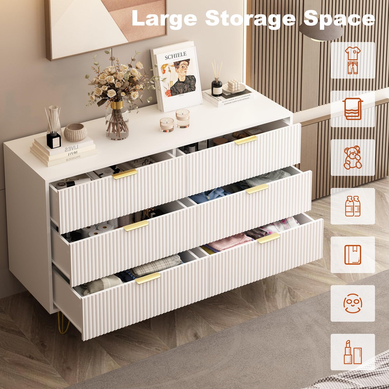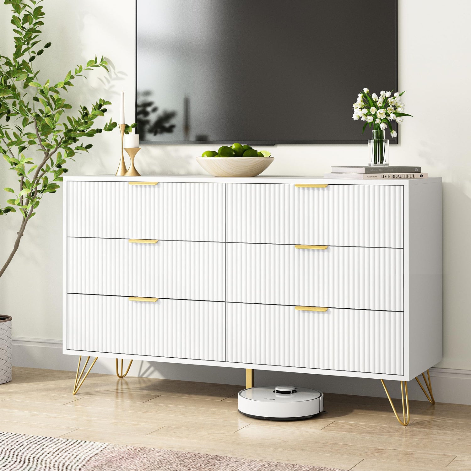 BAZELOR White 6 Drawer Dresser with Golden Handle, Fluted Wood Dressers, Modern Chest for Bedroom, Living Room, Hallway, Entryway