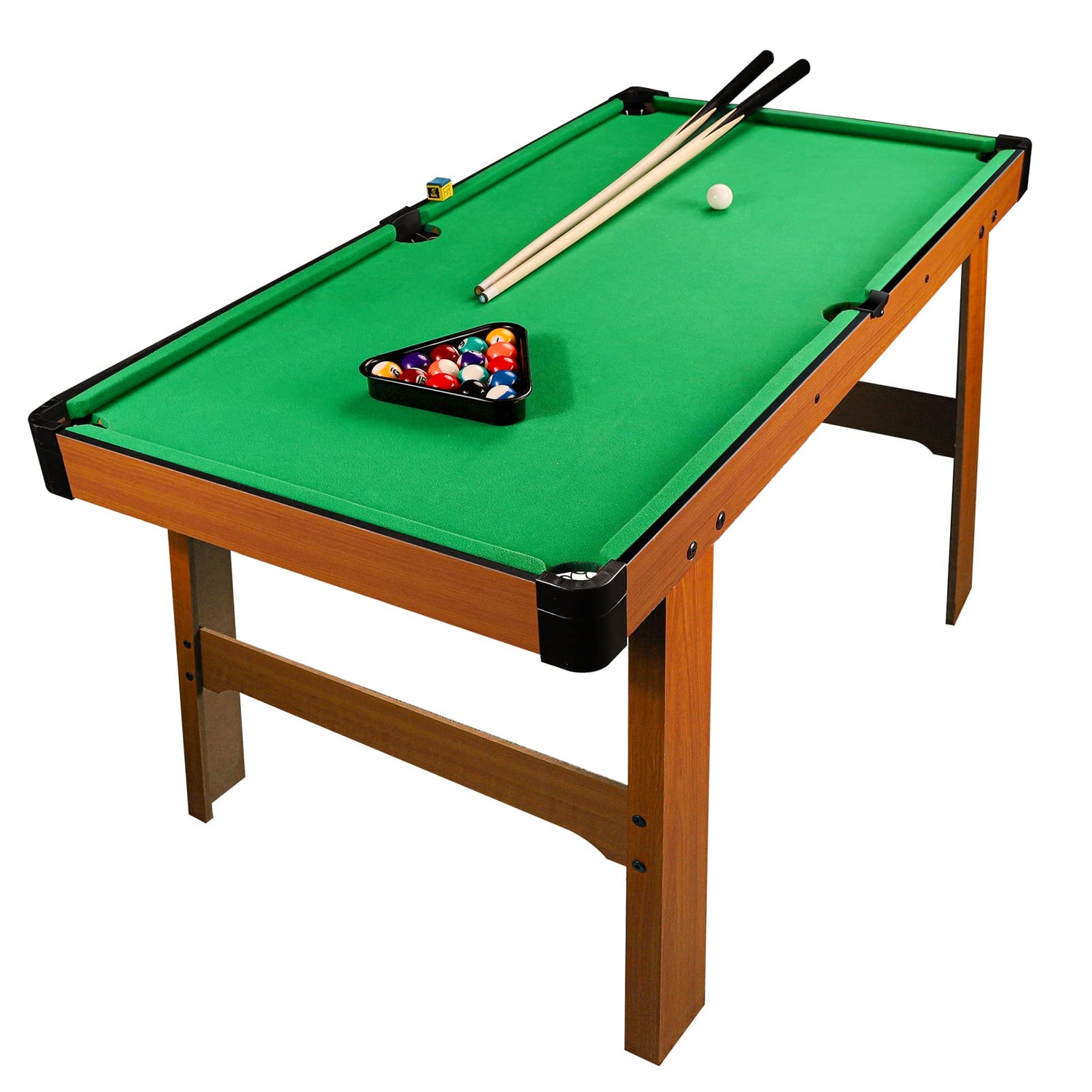 Competitive fun for the entire family! The pool table comes with a complete set billiards equipment, including sixteen 1.3"( 3.2 CM ) diameter pool balls, 2 pieces cues, 1 piece powder, 1 black triangle rack and a brush. Your kids will entertain for hours, and it greatly increase children’s logical ability. Besides, the outdoor pool table is foldable and portable, effectively save your home space. Made of odorless MDF, this kids pool table is durable and stable for long time use. And your kids will experience a realistic game with the green nylon cloth for classic game parlor look.