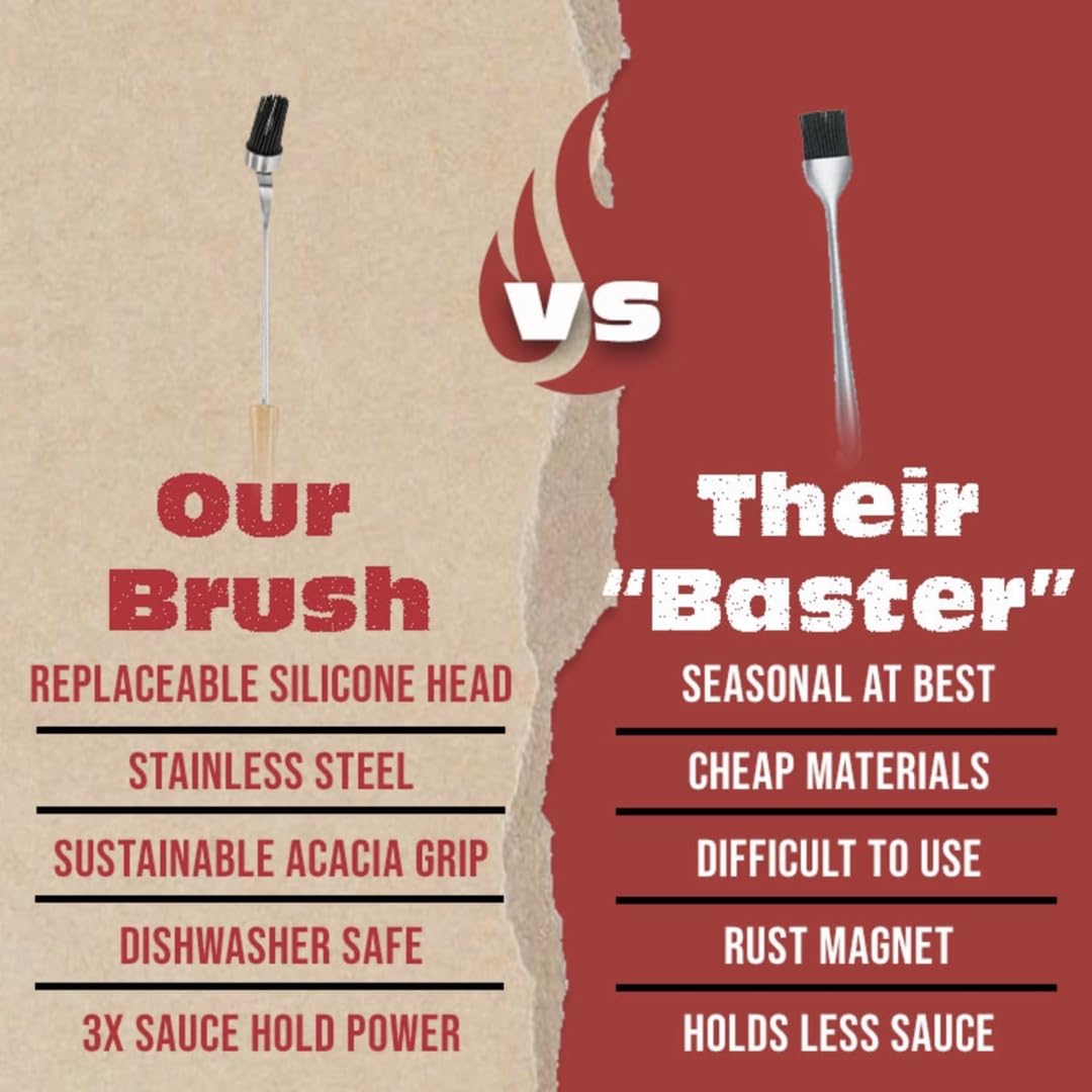 - ACACIA WOODEN HANDLE: Our smooth acacia wooden handle looks great and feels even better. Our heavy duty and high quality finish makes for a highly enjoyable experience with our basting brush for grill that will get attention from all of your guests!
