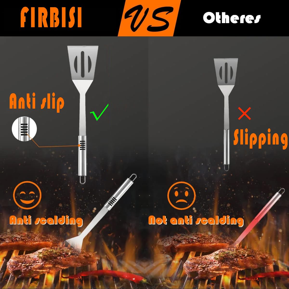- 420 Stainless Steel Grill Kit:FIRBISI Barbecue accessories made of heavy-duyty stainless steel;Rust -proof, anti -rust, corrosion resistance, antioxidant;The grill tools is easy to clean,dishwasher is safe;It's fine to barbecue, camping or cooking