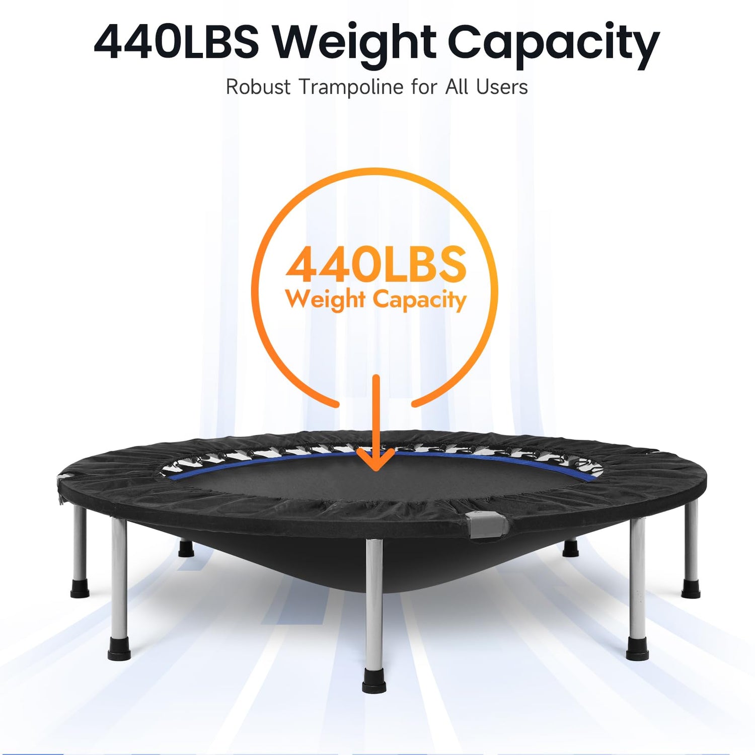 - Max Load 440 Lbs: Equipped with a sturdy steel frame, 8 strong legs, 40 high-strength stainless steel springs, and a wear-resistant PP mat (Max load 440 lbs), BCAN mini trampoline is suitable for individuals of all fitness levels and ages!