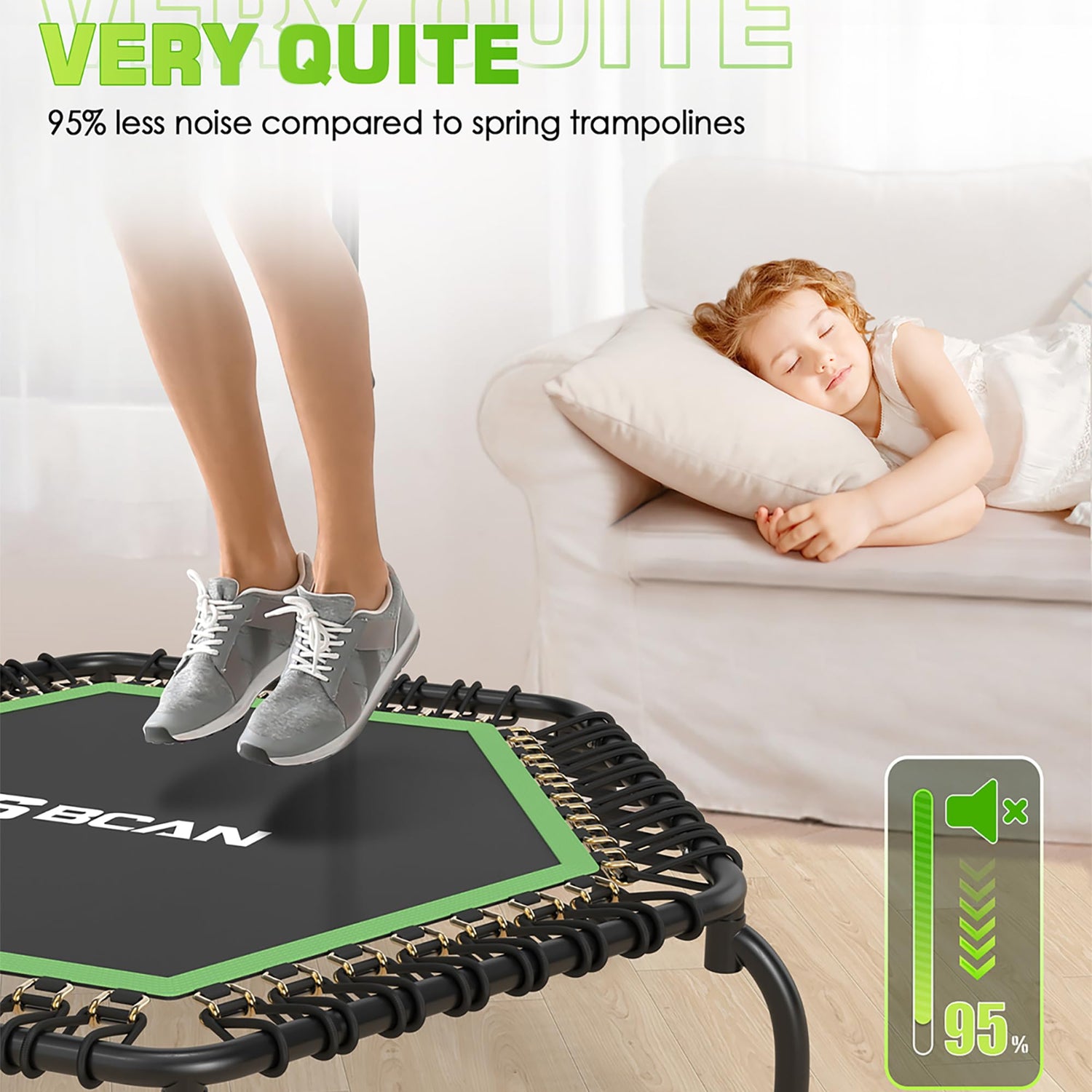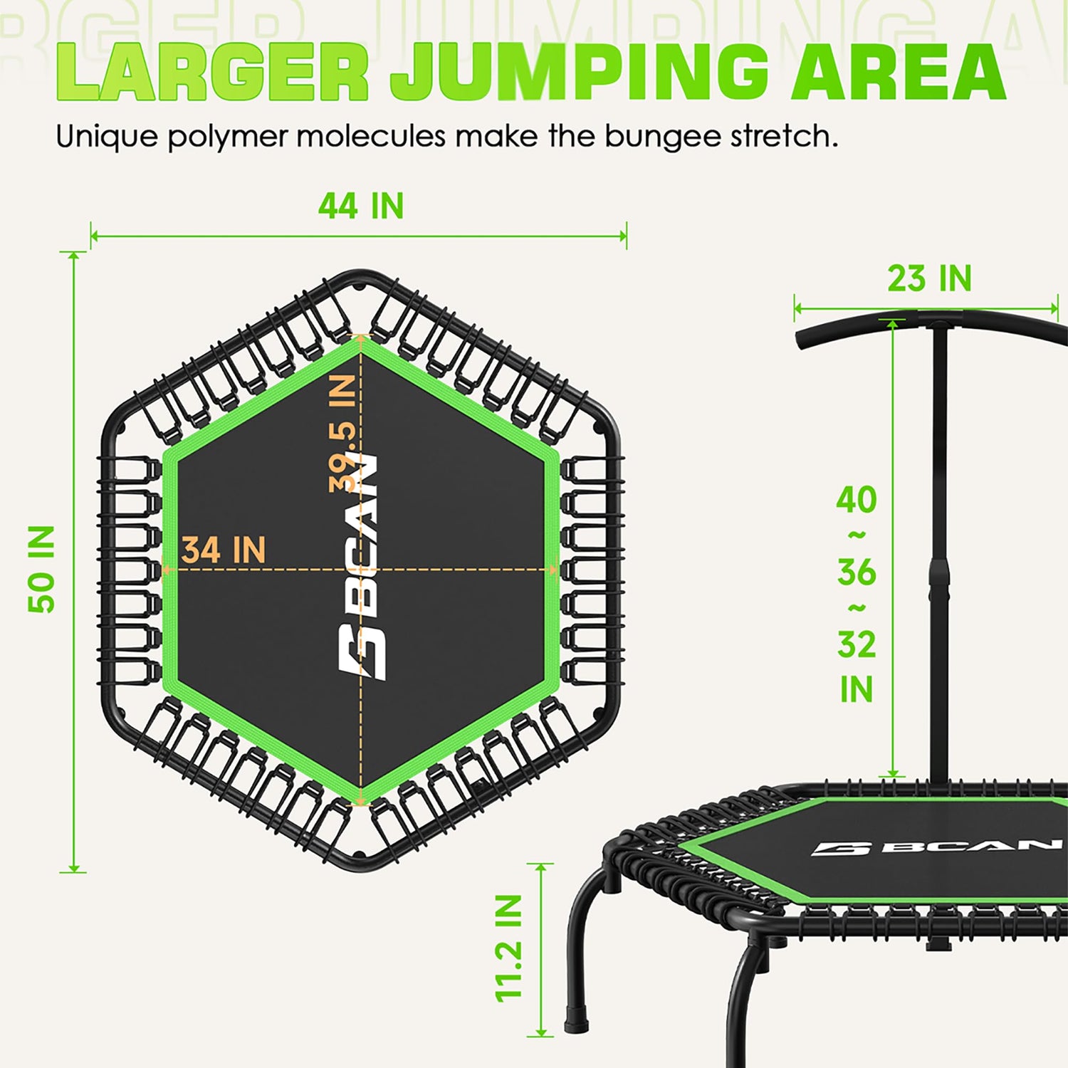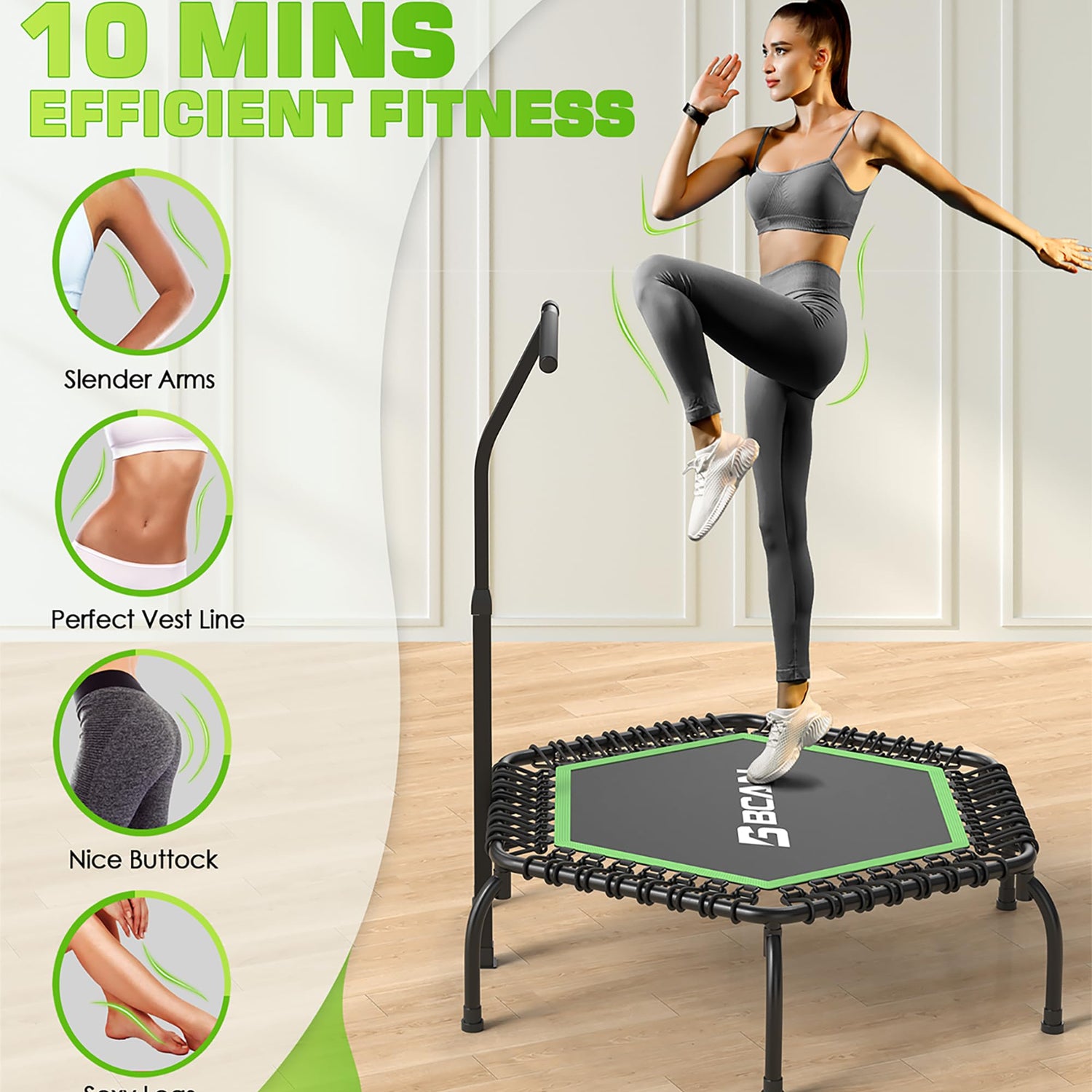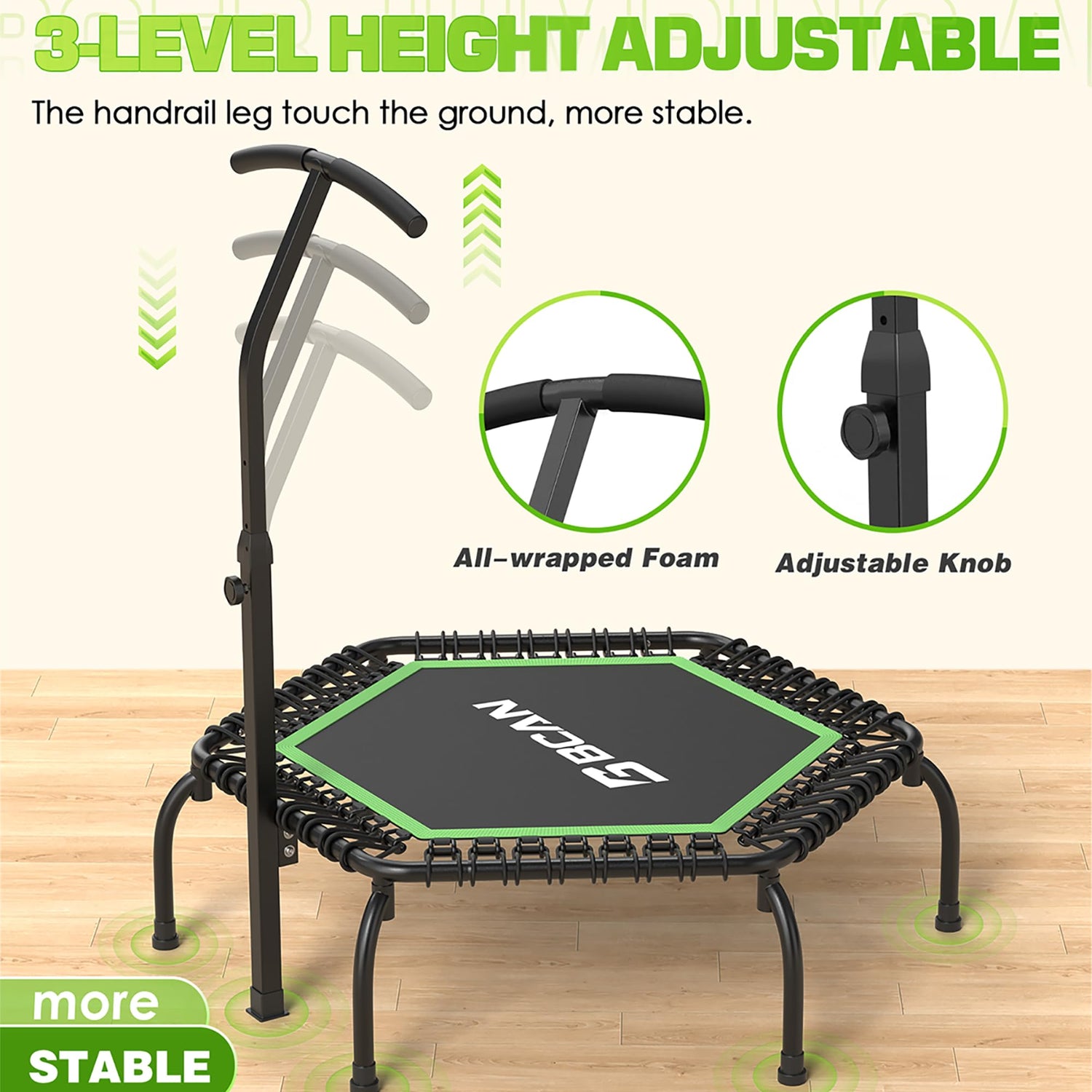 - 4-level Adjustable Handle: The fitness trampoline equipment with a 4-level height adjustable handlebar raged from 2'6" to 3'5" (on the mat), Jump with confidence