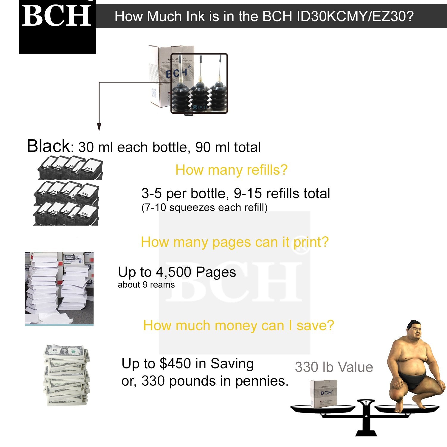- GREAT VALUE: Use this kit to refill your printer again and again, savings up to $400. Black is for 3-5 refills per bottle (30 ml), a total of 9-15 refills.