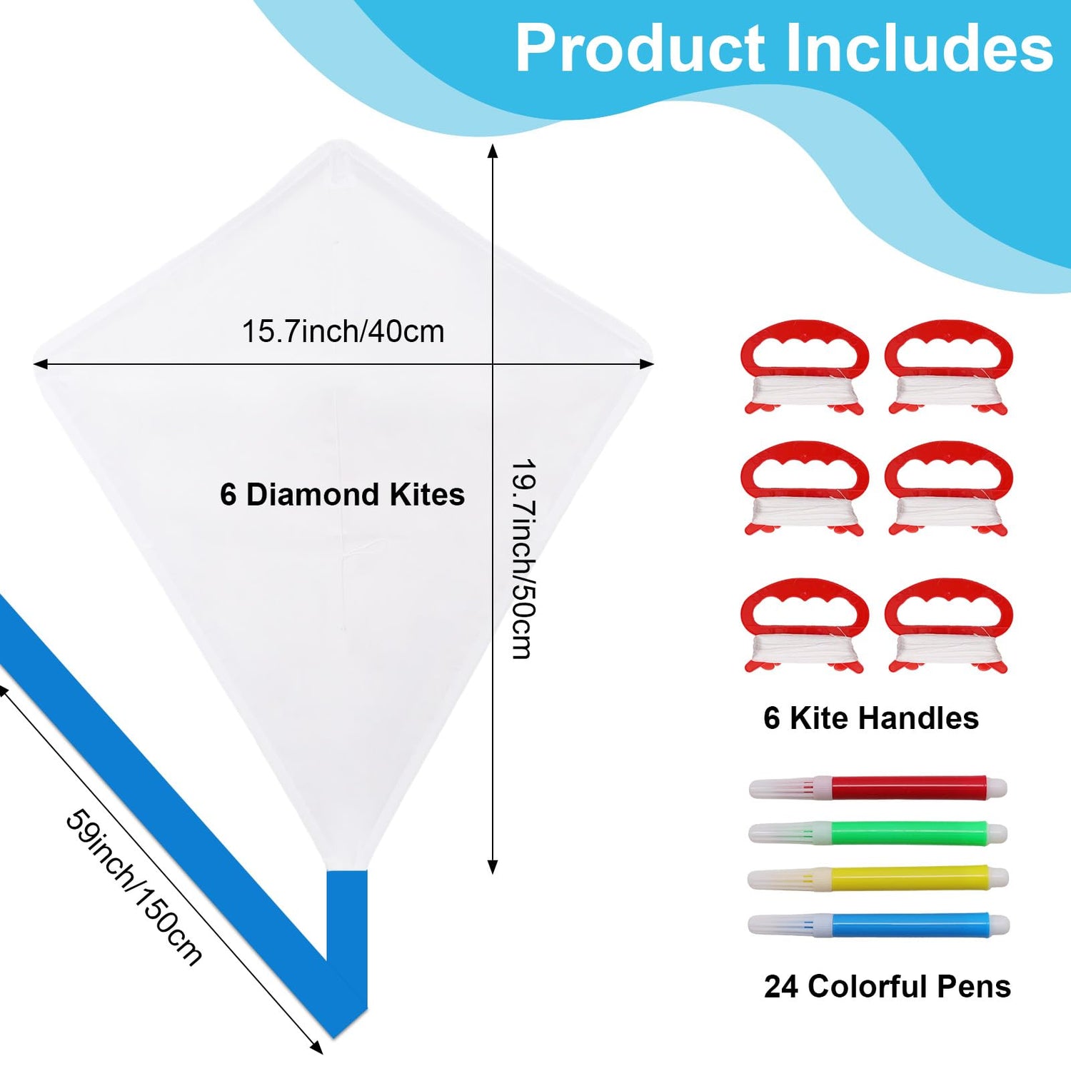 Included Components: 6 DIY Blank Kites, 6 Kite Handles, 6 Colorful Pens