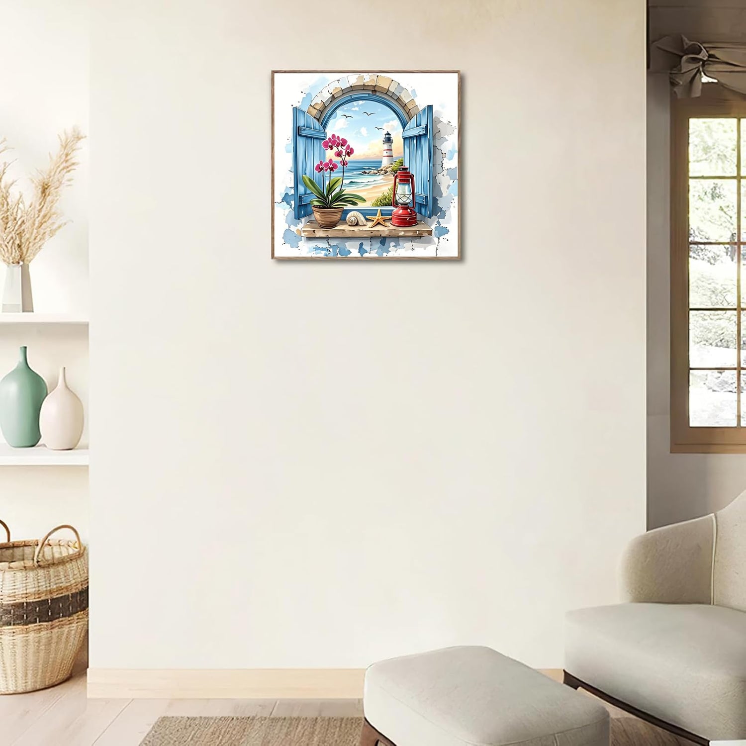 Beach Diamond Art Kits for Adults, Lighthouse Diamond Painting Kit for Beginner, DIY Full Round Drills Windowsill Diamond Dots 5D Gem Arts and Crafts Kit for Home Wall Decor 12x12IN
