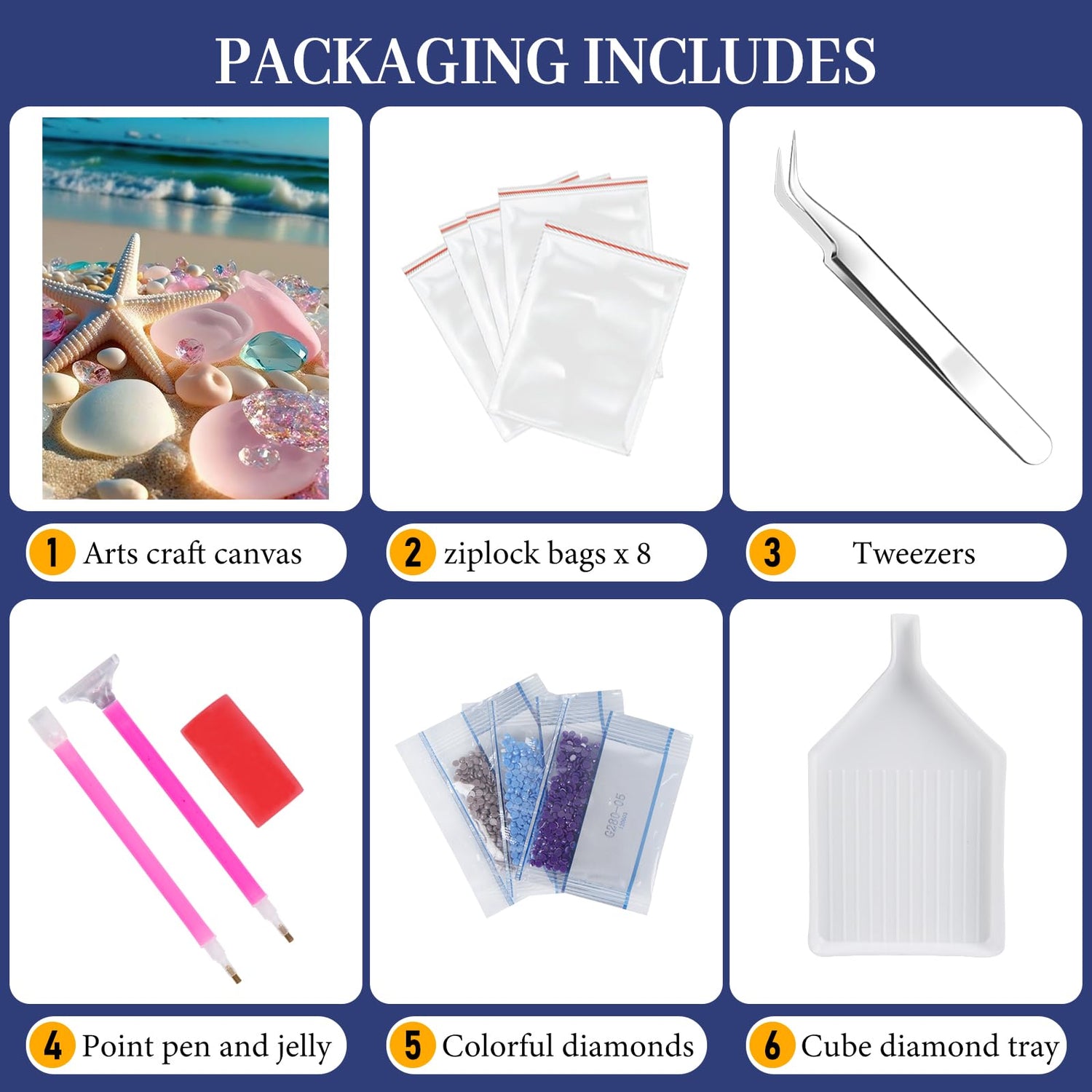 - Beach Diamond Painting Kits: Diamond painting accessories and tools comes with everything you need! Including 1x waterproof painting canvas, 1x trays, 1x wax, 8x self-sealing bags, 2x point diamond pen, 1x tweezers, and enough diamond art beads. For each diamond art kit we'll provide 30% more diamond beads than needed