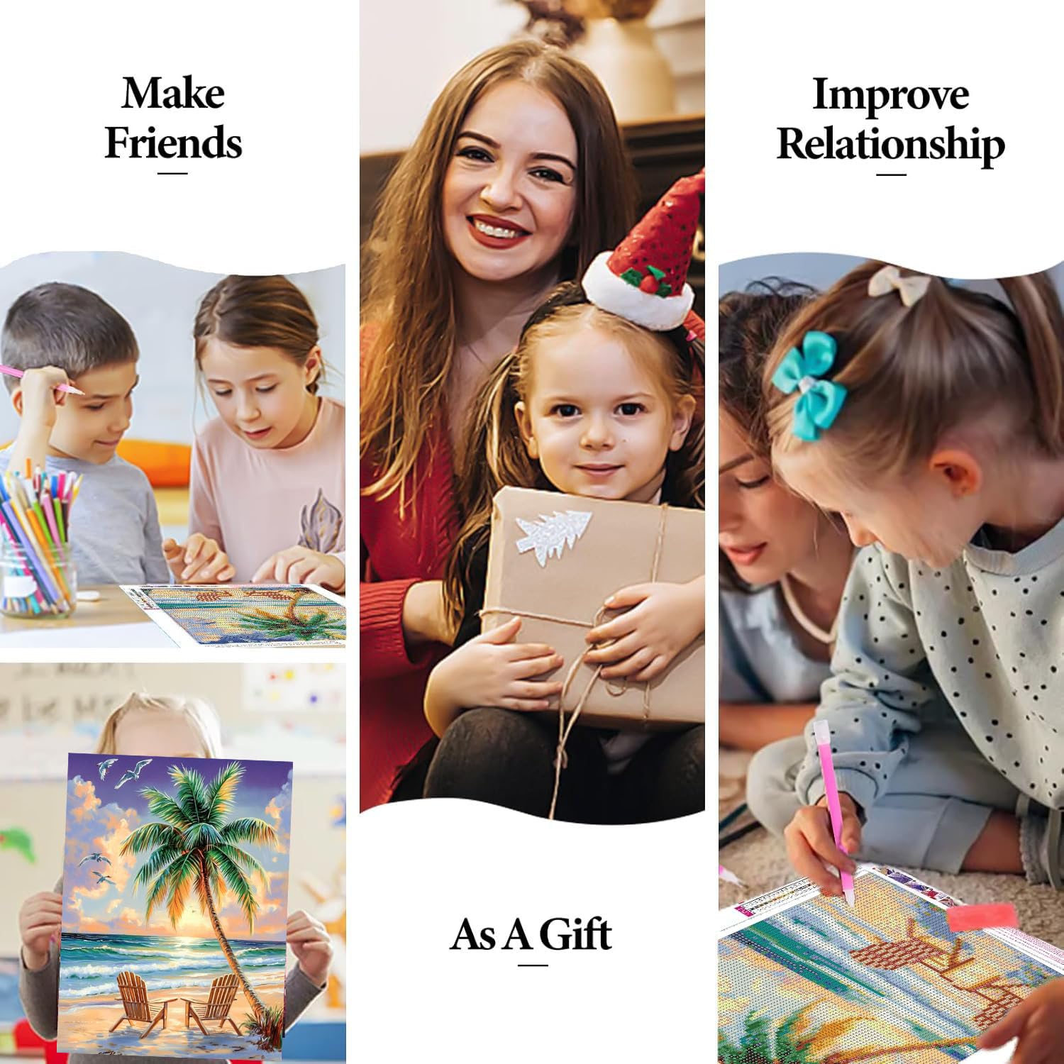 - Special Gifts: Beach diy diamond painting kit for adults will be the better gift for friends and family. It can help parents kill time; can cultivate practical ability and patience. Improve their understanding of color and aesthetics. They can relieve stress for friends