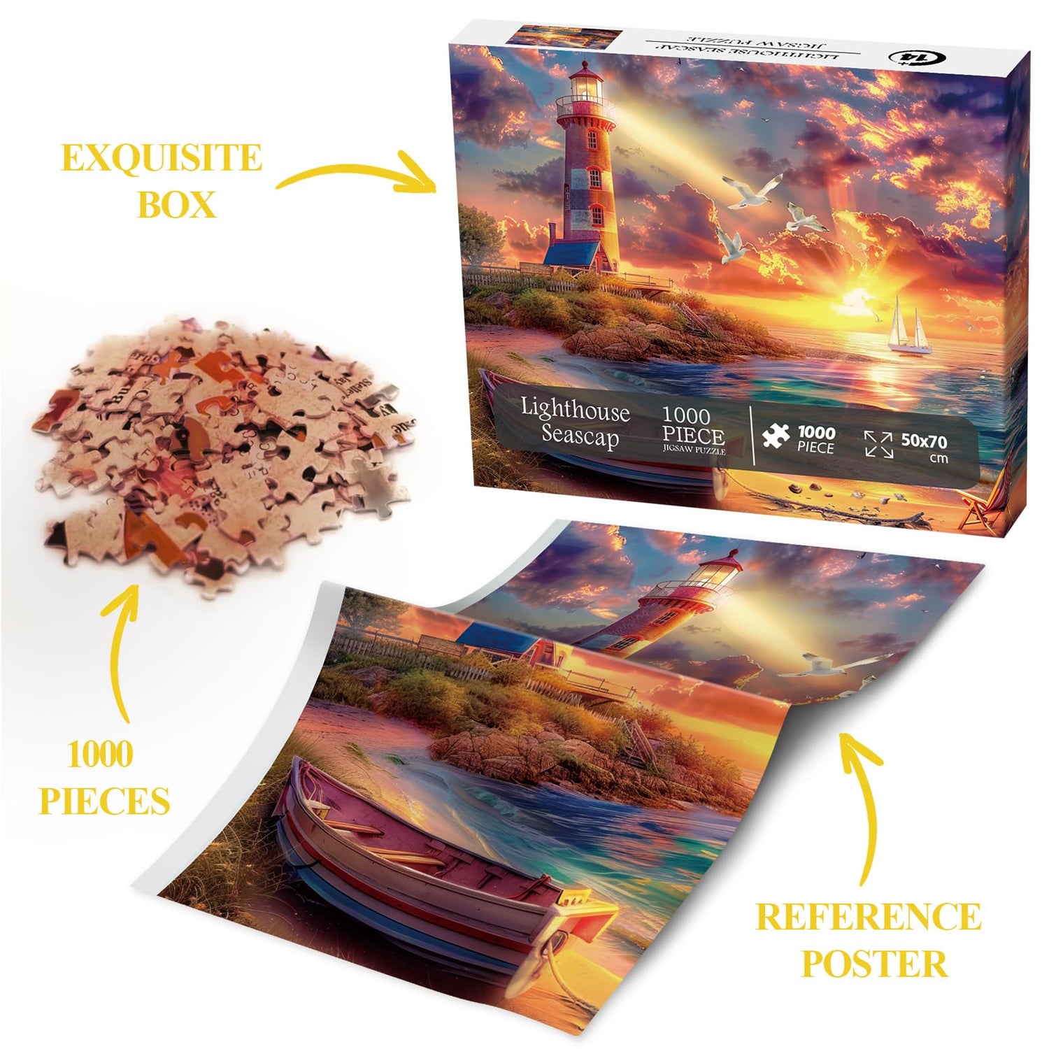 Details: Beach Ocean Lighthouse Puzzle for Adults 1000 Pieces Nature, Summer Sunset Landscape Jigsaw Puzzle, Sailboat Scenery Puzzle