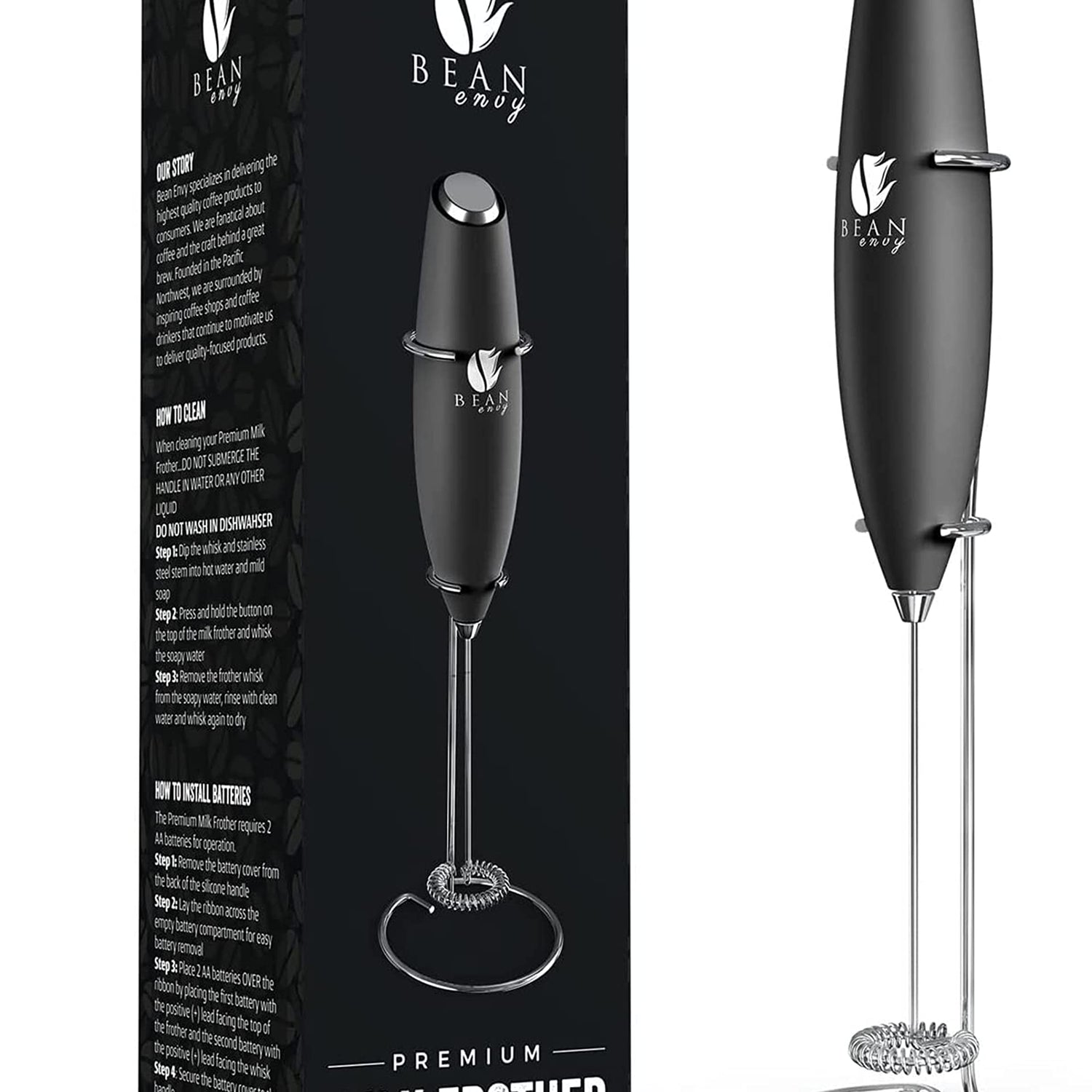Bean Envy Milk Frother Handheld for Coffee - Electric Hand Blender, Mini Drink Mixer Whisk & Coffee Foamer Wand with Stand for Lattes, Cappuccino, Matcha and Hot Chocolate - Kitchen Gifts - Black