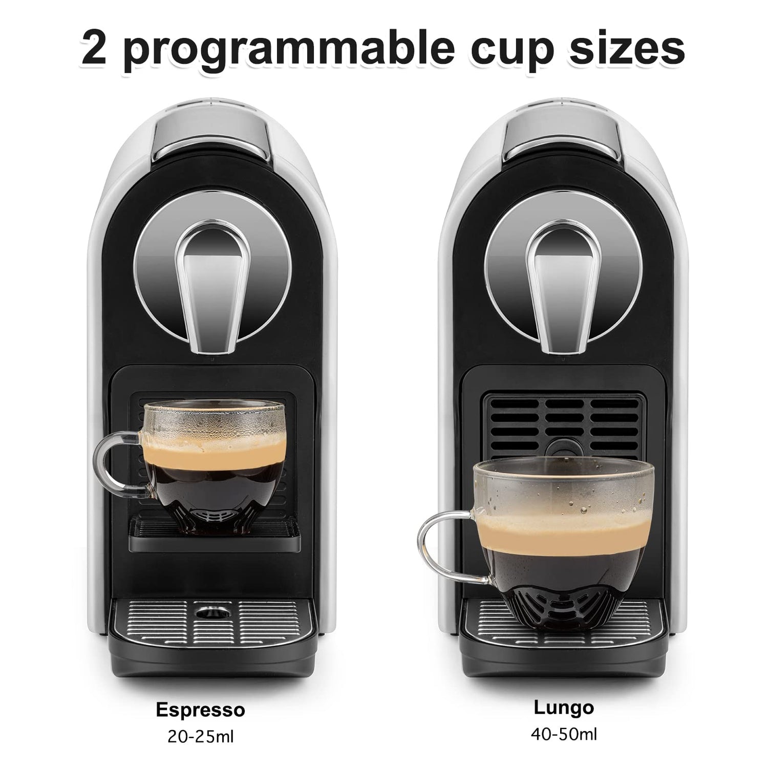 - 【Espresso & Lungo】Our mini espresso machine offers 2 programmable cup sizes with adjustable cup tray for espresso (approx 35ml) and lungo coffee (approx 65ml) and also support personalized setting extraction.