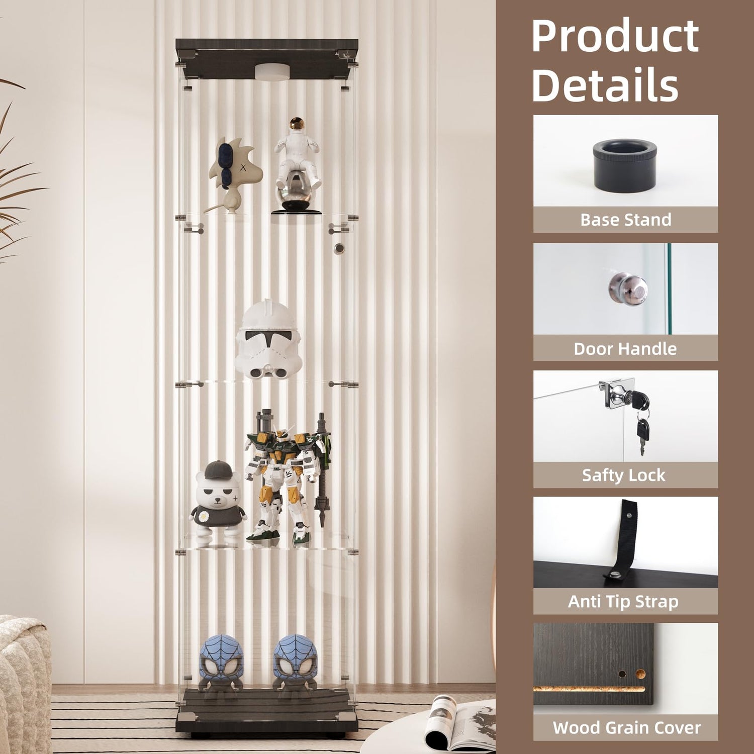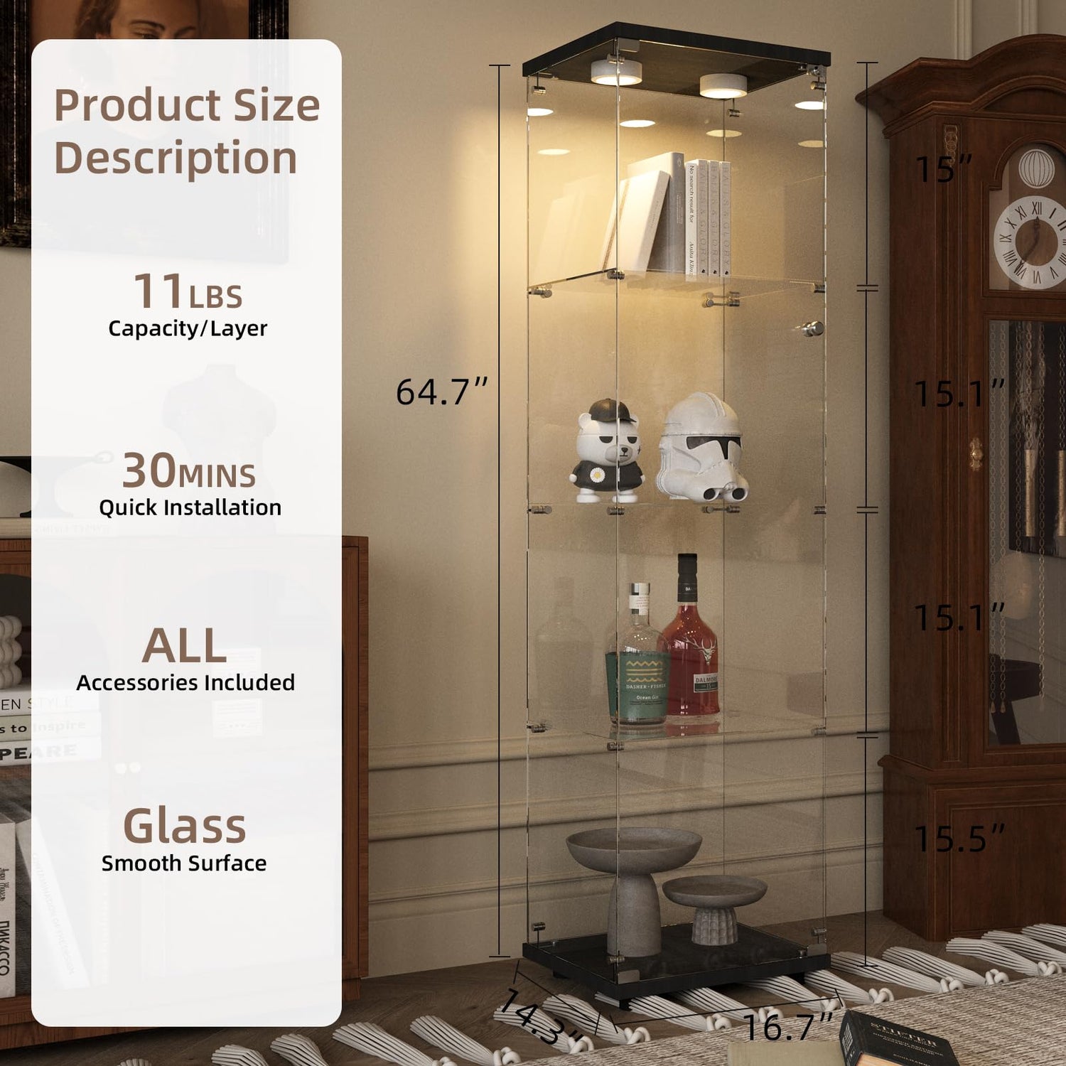 - Quick Installation: Designed for convenience, this glass display cabinet can be easily assembled using its quick installation process. Simply peel off the double-sided tape and attach the lights to the top of the cabinet. No complicated wiring or tools required, making it a hassle-free setup