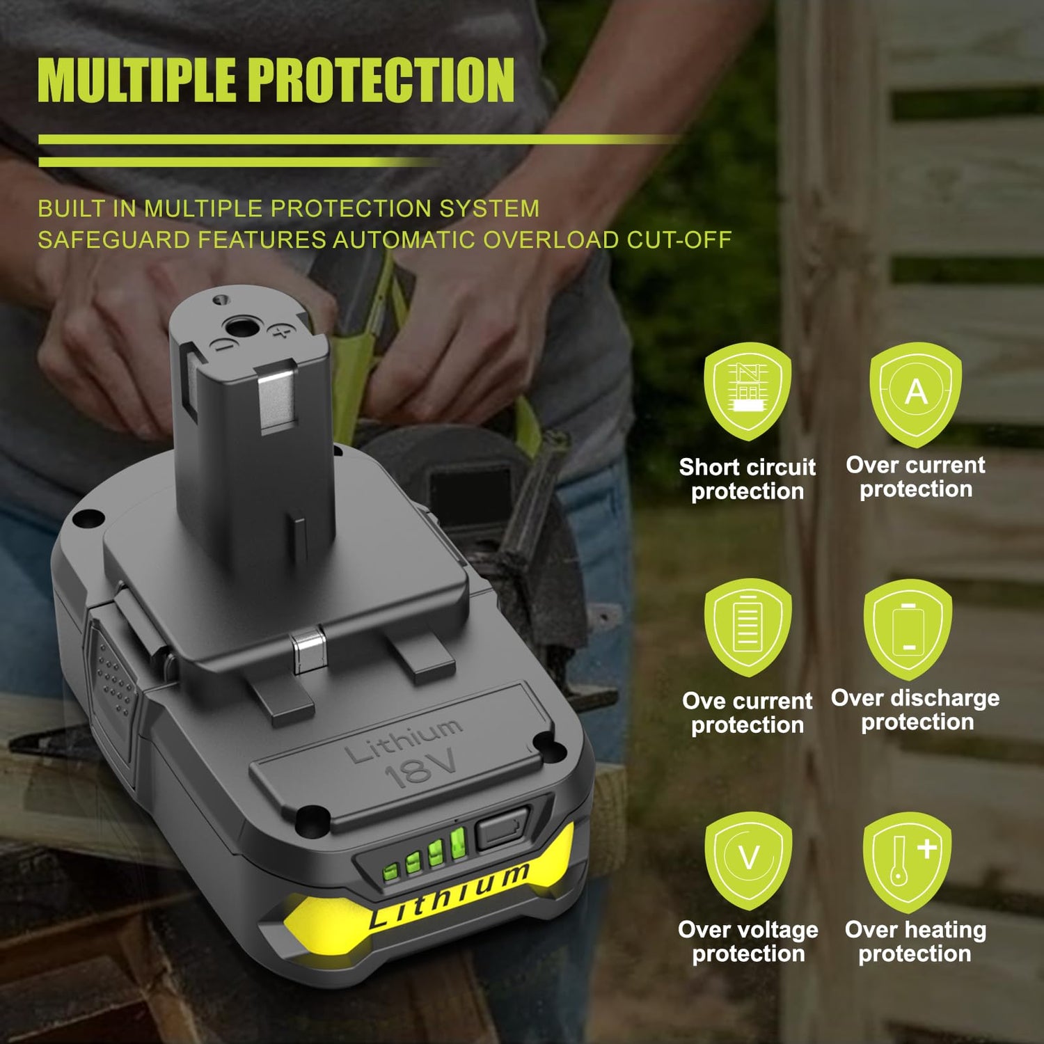 - 🌳【Authoritative Certification & Safe】Our Replacement Batteries for Ryobi 18V are CE/FCC/RoHS certified for your work safety! Built-in multi-protection system with over-charging, over-discharging, over-current, over-heating and other protection functions, to achieve short-circuit protection and voltage regulator circuit effect, to protect the battery output power and the use of safety!