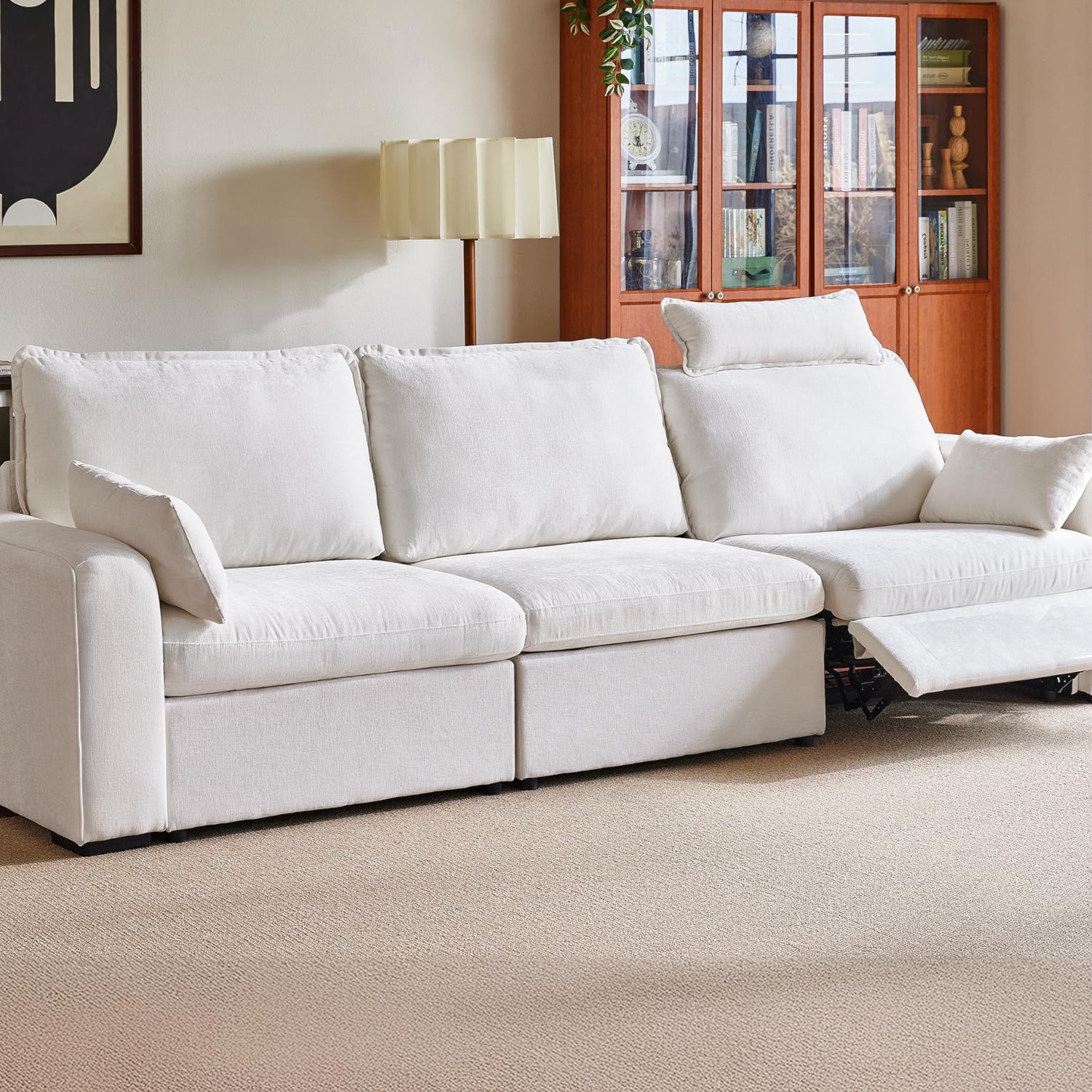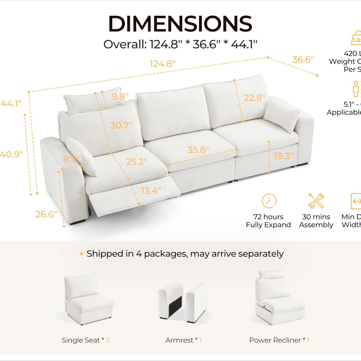 Bedeep 124.8'' Oversized Power Recliner Sofa with Headrest, Extra Wide Deep Modular Cloud Sectional Reclining Couch Wall Hugger, Convertible 3-Seater for RV Home Theater Living Room, Chenille, White