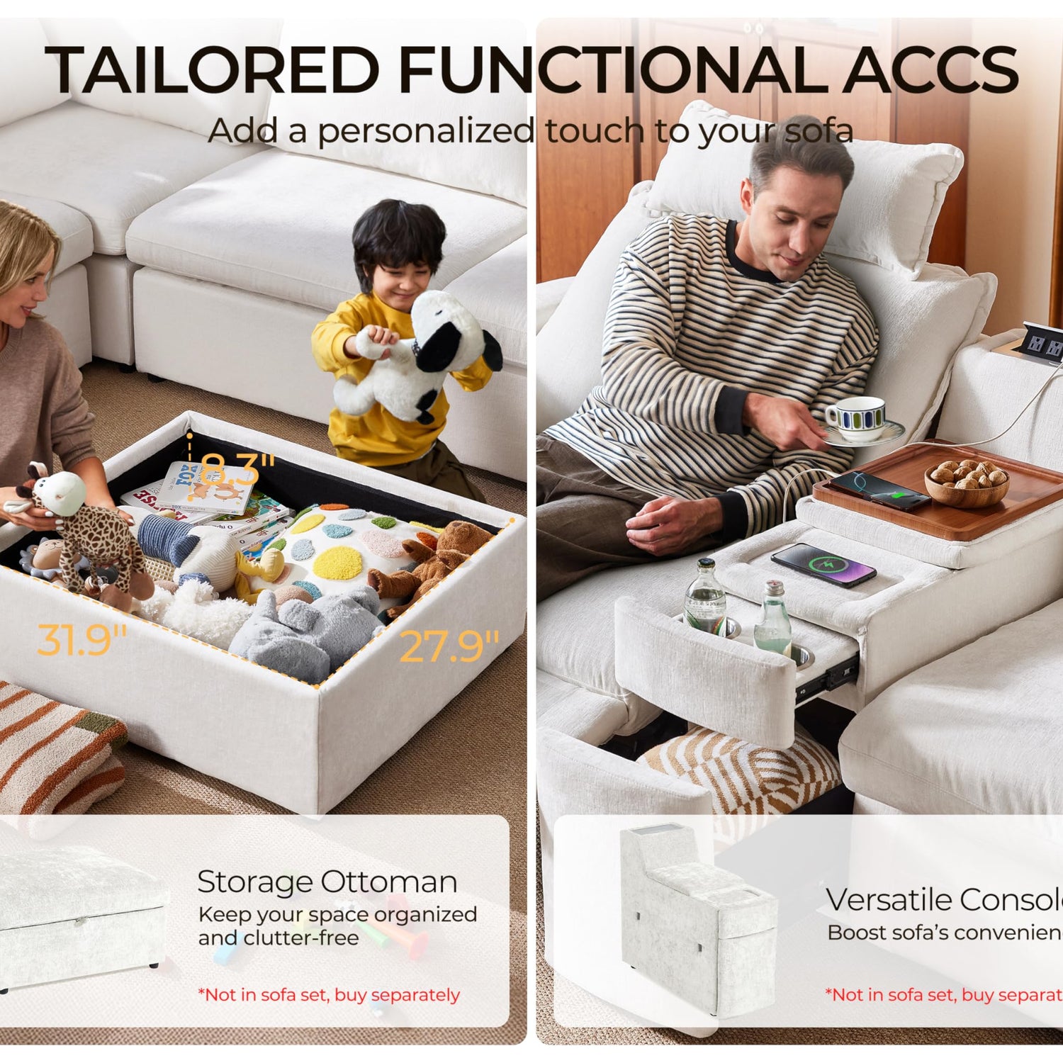 - 【Optional Hidden Storage for a Tidy Space】 Maintain a clutter-free home with the optional storage ottoman module, designed to keep blankets, pillows, or toys neatly tucked away. Convertible Couch with storage ensures essentials are always within reach yet out of sight, adding both function and style to your oversized fluffy modular sofa with recliner. Note: Storage is only available in configurations with the ottoman module