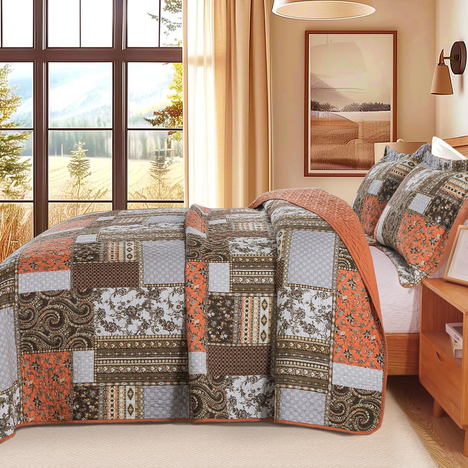 BEDIFANY Farmhouse Cotton Quilts Queen Size for Fall - Lightweight Patchwork Autumn Bedspread Set for Bed Coverlet - Highly-Woven Soft Reversible Bed Spread for All Seasons (Floral Orange) 3 Pieces