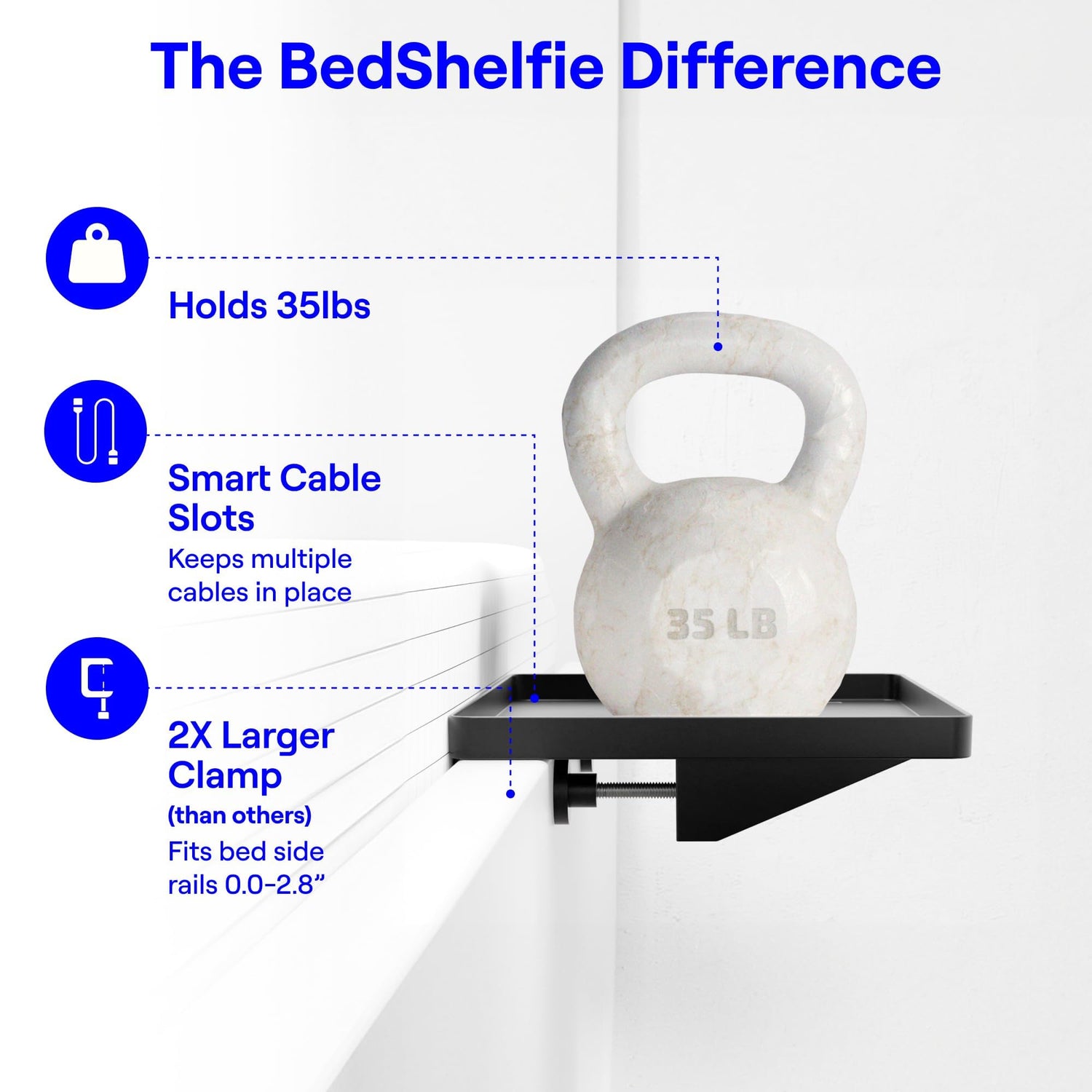 - EFFORTLESS NO-TOOL INSTALLATION: Our intuitive design eliminates the need for complex instruction manuals. The BedShelfie caddy tray is incredibly versatile, serving as a headboard shelf, sofa tray, changing table, or cord organizer. It is particularly popular with city dwellers, as one of dorm room essentials for college students, a room decor, a teen room nightstand or a kids side table. Safely holding up to 35lbs, this floating nightstand can hold a 13-inch MacBook, phone, water, and more!
