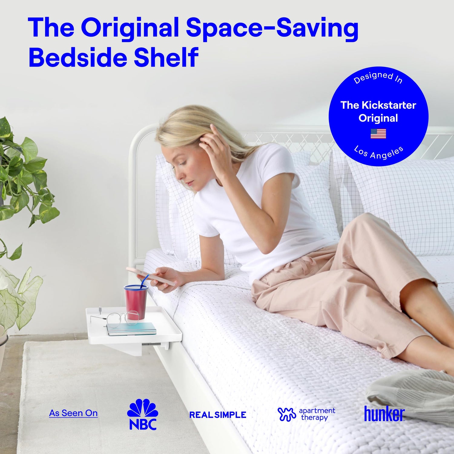 - ORIGINAL, TRIED & TRUE DESIGN: Launched from Kickstarter and designed in Los Angeles, the Bedshelfie bedside shelf has been featured on top publications such as Apartment Therapy, BuzzFeed, and Real Simple. Our original bed shelfie bed shelf organizer table helps small space dwellers make the most out of their space, from those in tiny bedrooms to college students in need of a top bunk bedside table. It is the preferred choice for bed side organization and storage.