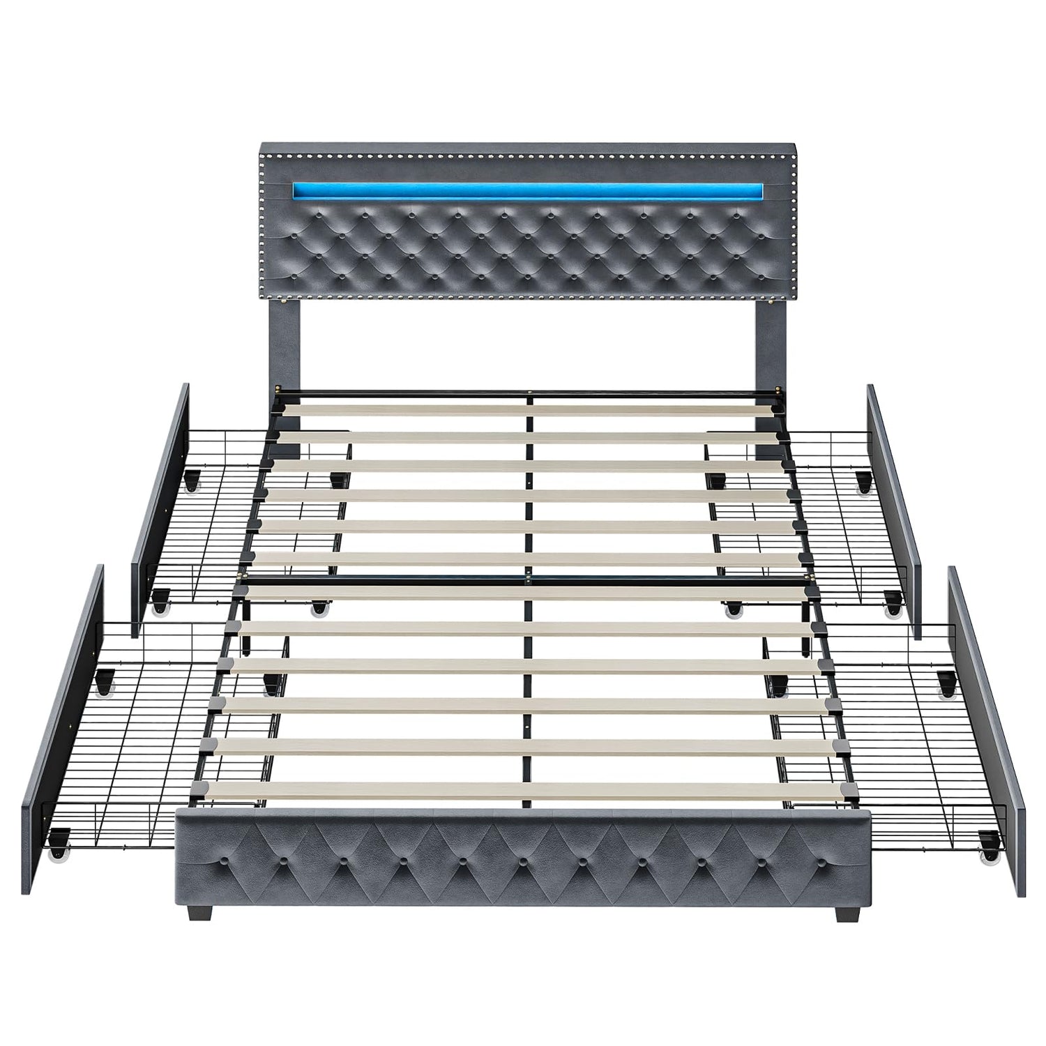 BedsPick Queen Size Bed Frame with LED Lights, Velvet Upholstered Platform Queen Bed Frame with 4 Storage Drawers and Adjustable Headboard, No Box Spring Needed Queen Bedframe, Noise Free, Light Grey