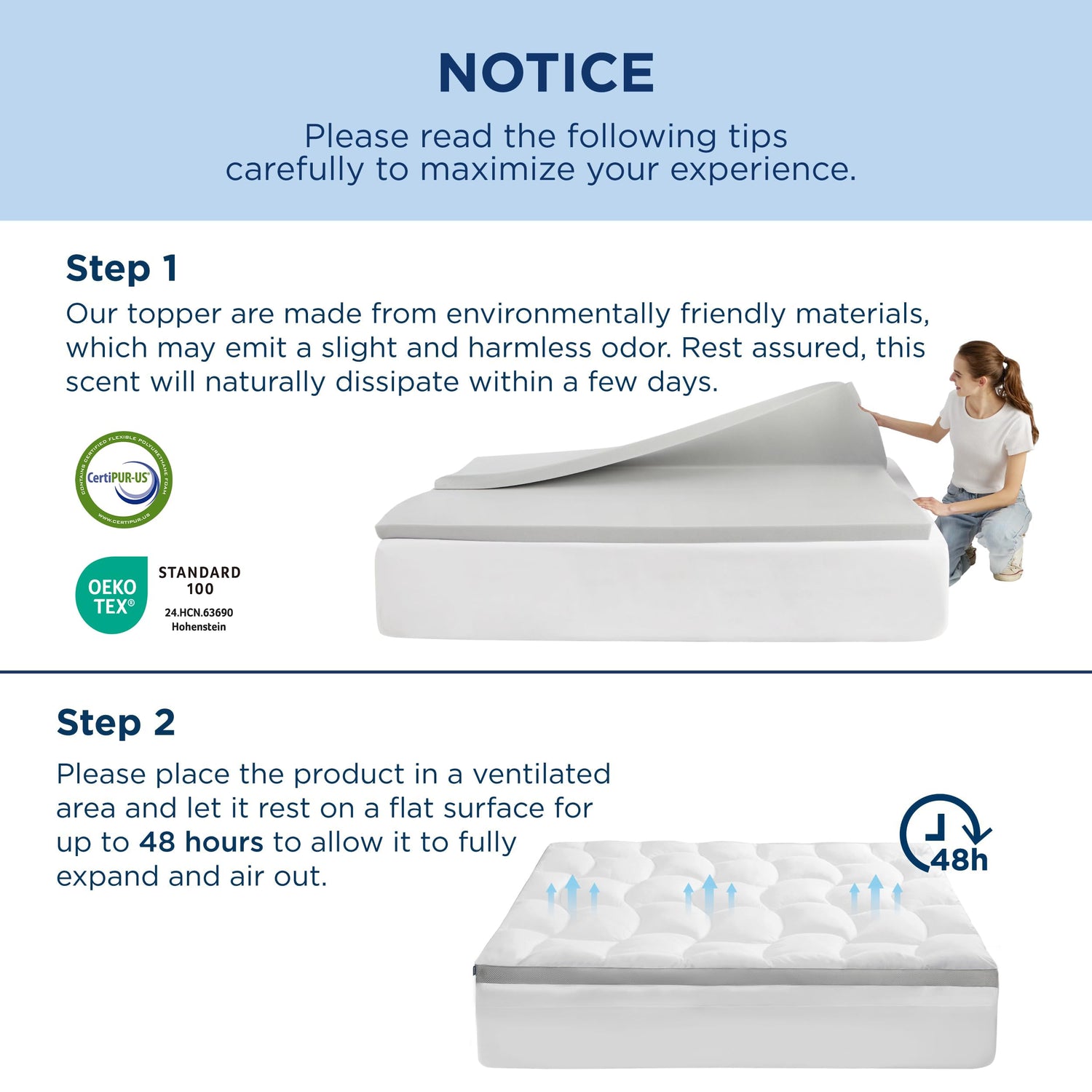 - 【USAGE TIPS】 The detachable mattress pad is machine-washable for easy maintenance. To ensure proper use, wash only the mattress pad separately, as the memory foam layer is non-washable. Before use, lay flat at a ventilation opening for 48-72 hours to ensure it's fully stretched and odorless